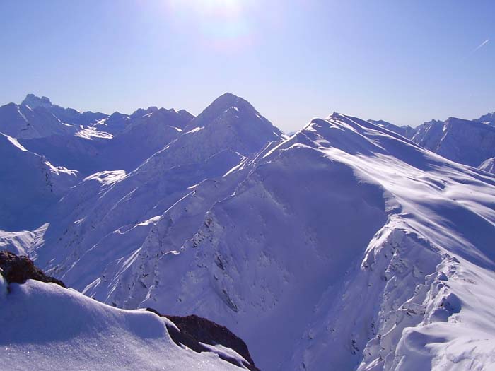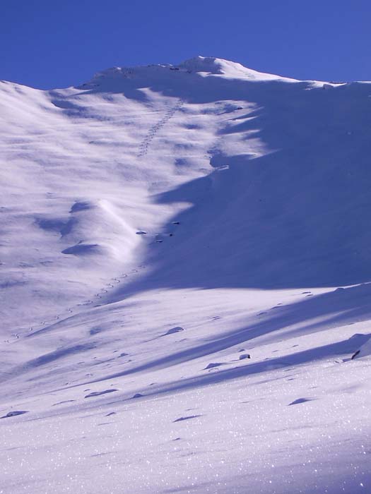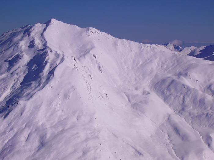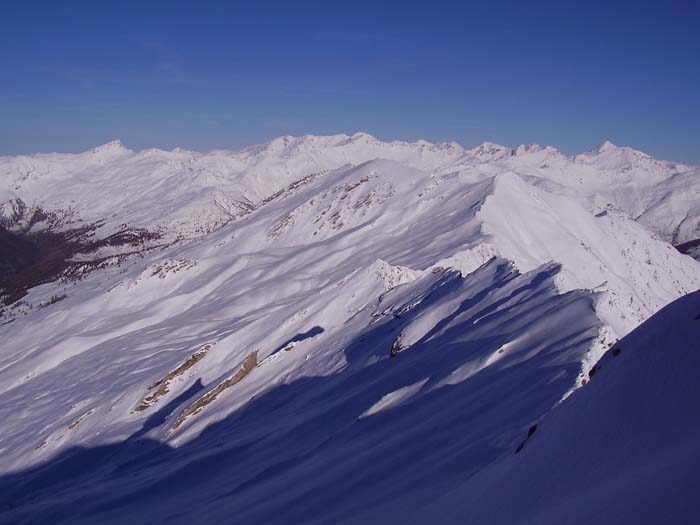 Le vent ne semble pas avoir trop soufflé par ici après les dernières chutes. Près des cols, on trouve un peu de neige légèrement liée (parfois sur 25 cm d'épaisseur), mais cela ne forme pas de vraies plaques. Dans le versant NO de Peynin, il y a parfois une vague couche fragile enfouie à mi-hauteur, mais ce n'est pas méchant. Dans l'ensemble, ce début de saison est prometteur, cela change de ce à quoi on a droit en général dans les Alpes du sud.