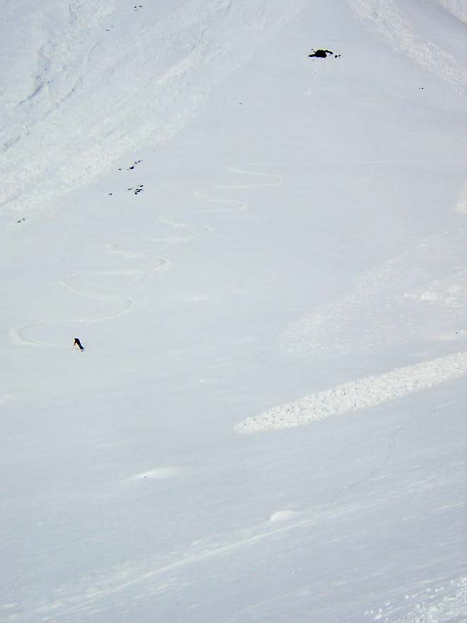 Excellent sous 2700m ("moquette de printemps"), plus haut les 5 cm de la veille ont empêché le regel et reposent sur une neige pourrie très humide. Boules de coulées petites à moyennes dans le couloir et toutes les pentes du versant