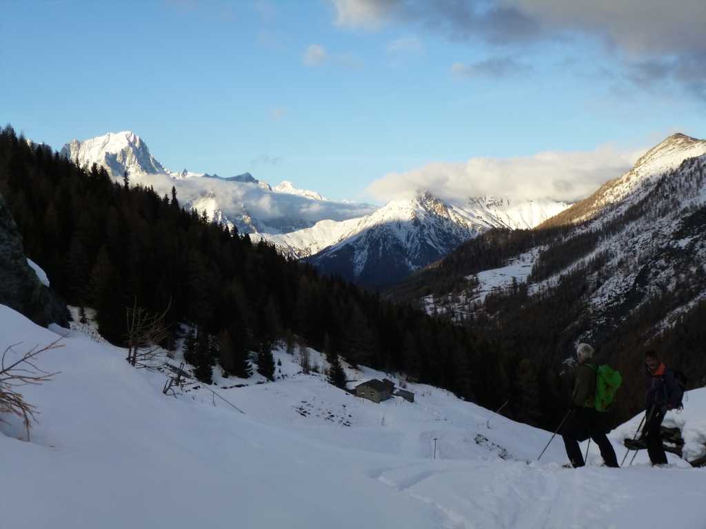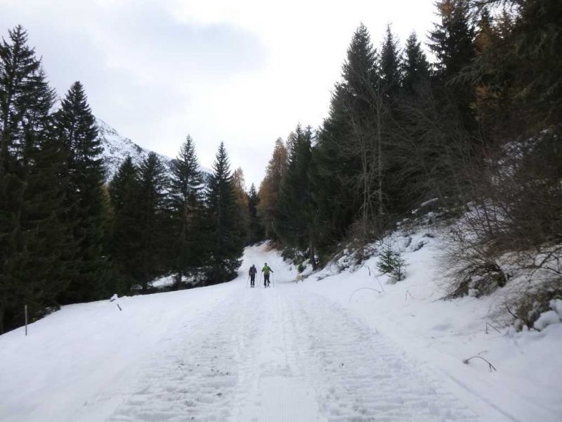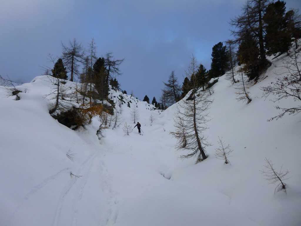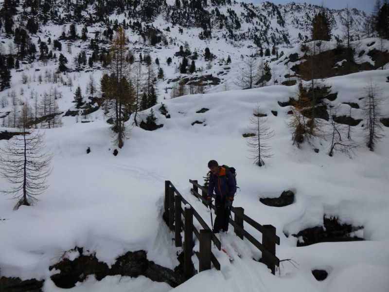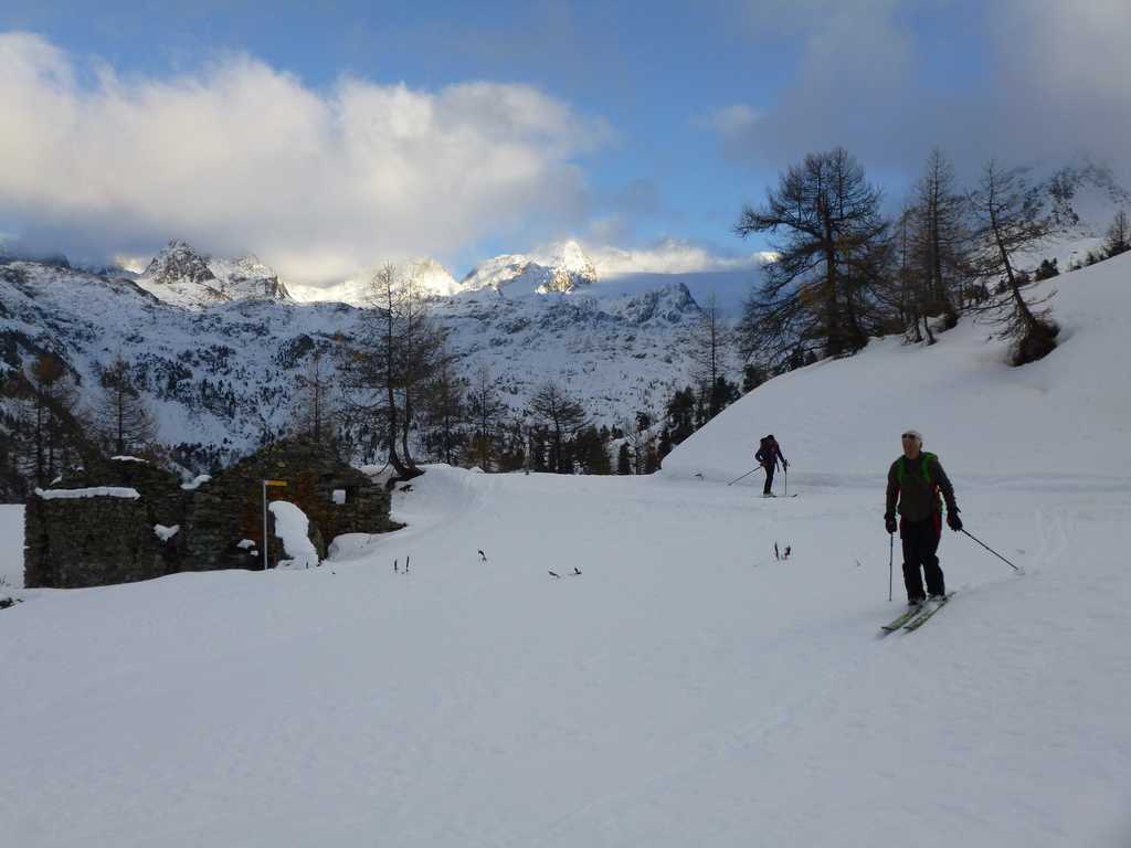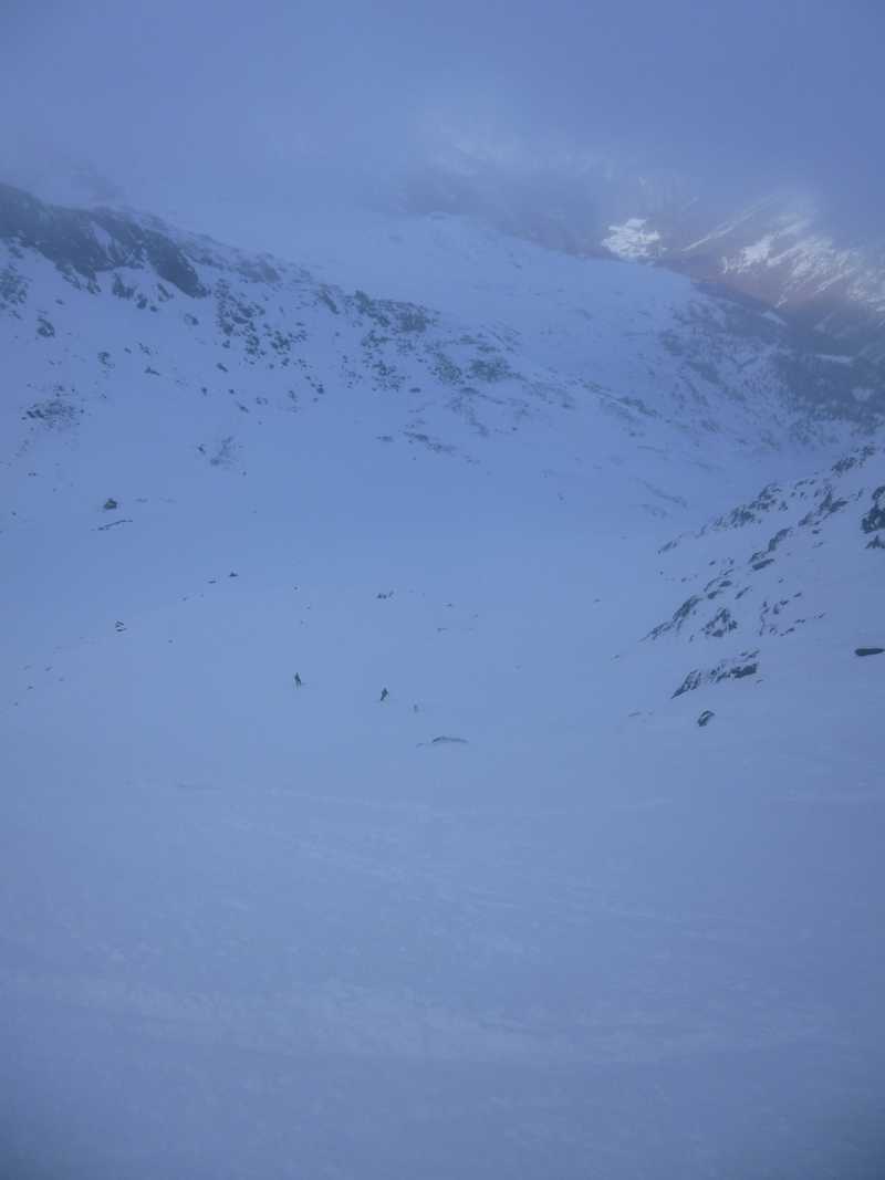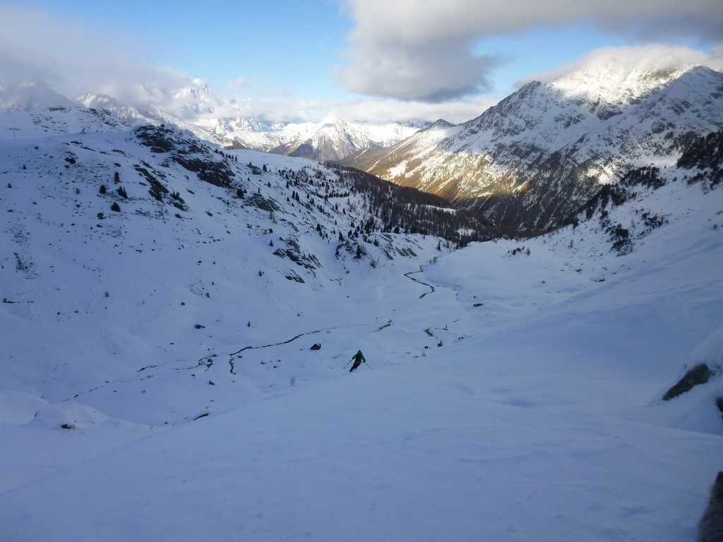 Nettement plus de neige ici que plus à l'est dans la vallée d'Aoste. En dessous de 2100m la neige est bien humide. Au-dessus la sous-couche est ferme et on retrouve vite de la poudreuse agréable à skier.