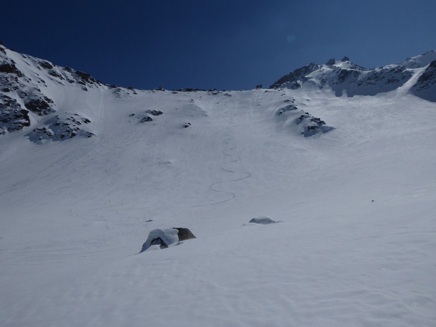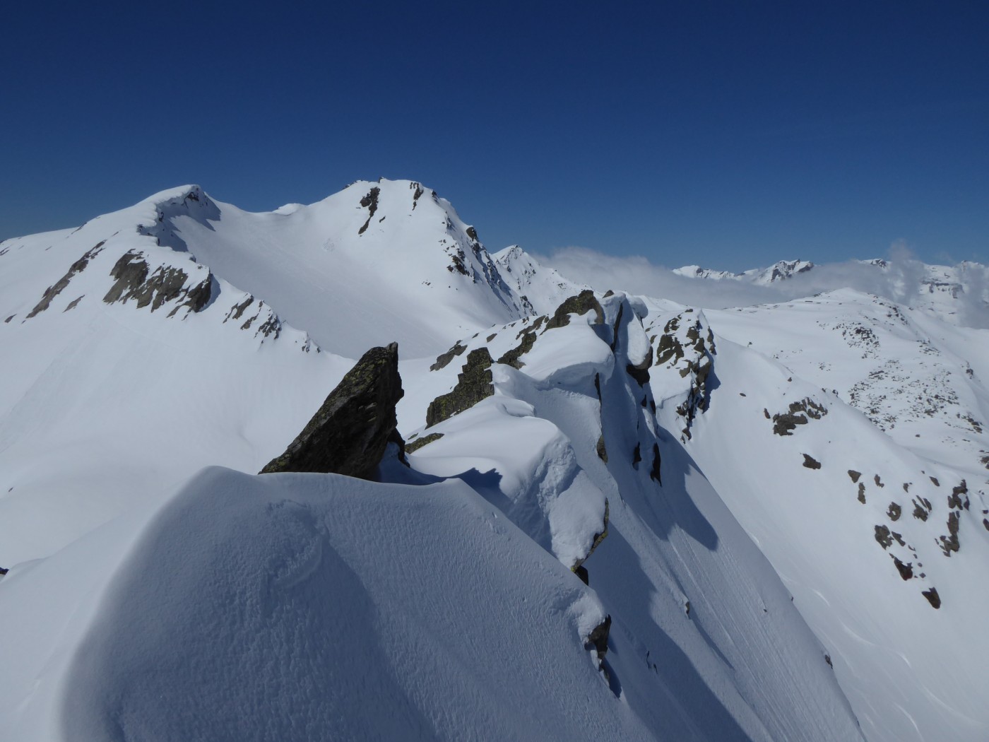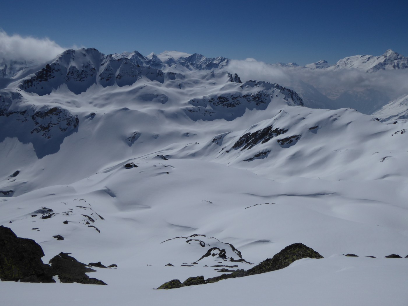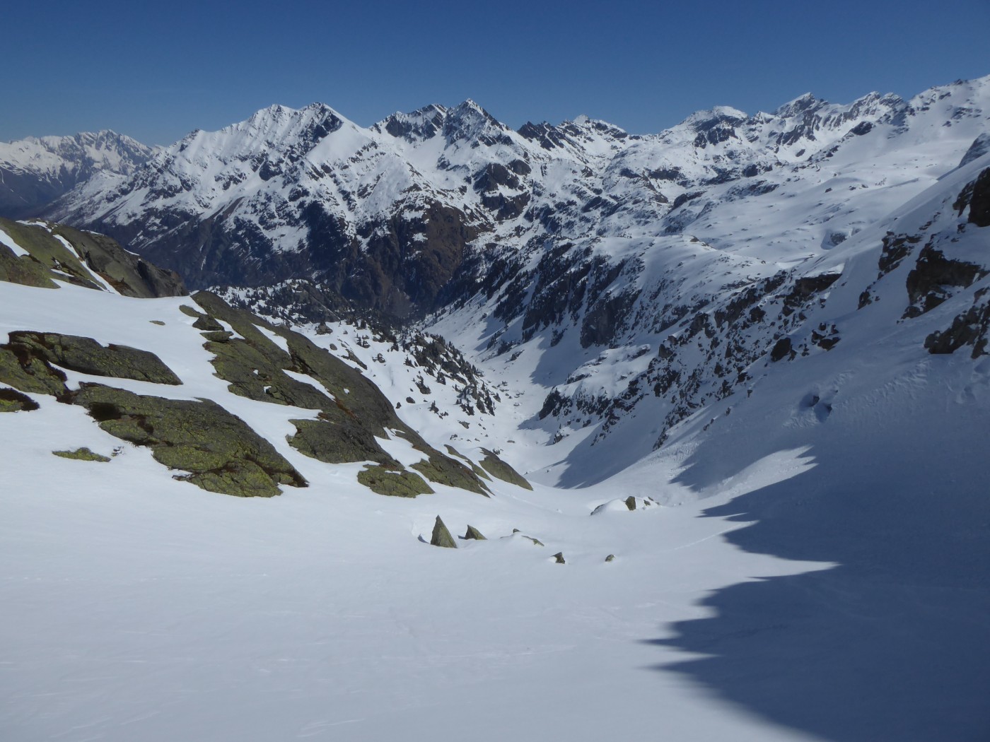 Je n'ai chaussé les skis qu'à l'entrée de la combe Sozin (1840m). J'ai opté pour un retour par le vallon des Ponteilles pour profiter des pistes de La Thuile et skier jusque dans la vallée. La station est ouverte jusqu'au 22 avril.