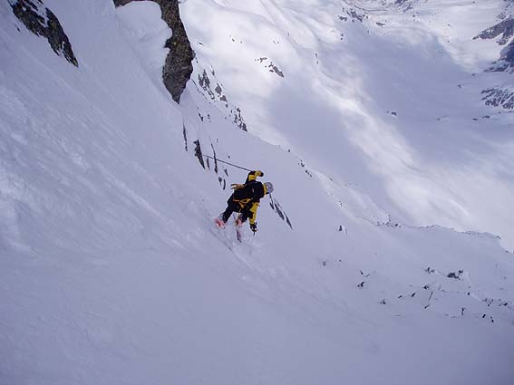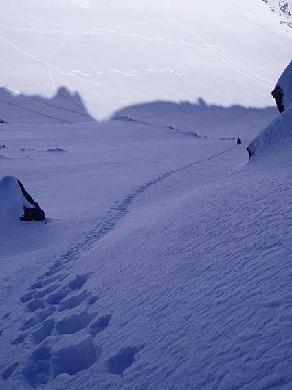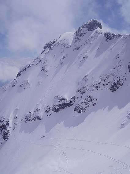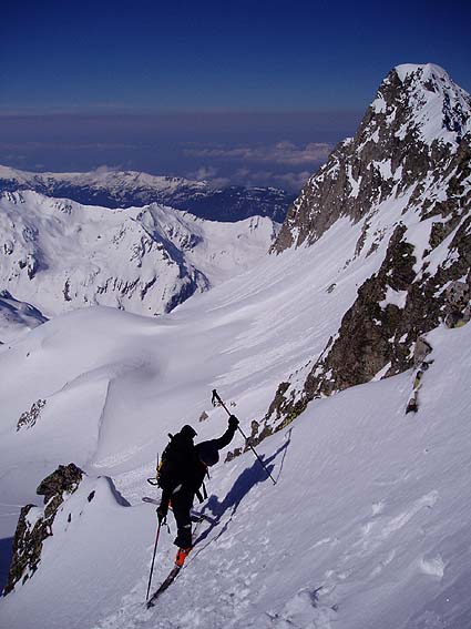 Quelle bambée dans cette Belledonne si bien enneigée ! Festival de poudre dans les deux premières faces avec chaussage au sommet même du pic du Frêne (superbe !). Le circuit prévu devait permettre de finir en encapant à vue la face ouest du Charnier. Nous avons attaqué le haut de la face dans un brouillard à couper au couteau puis, nous sommes dit que c'était un peu osé ce genre d'initiative. Tant pis. Remontée à pied au sommet et descente par la voie normale sur le Veyton. Côté cotations, le Crozet nous a paru à vaches. Envie de le mettre 4.3 mais après mesures sur la carte, on ne trouve pas moins de 45°/300 avec le court coup de cul en haut. Faut p't'être pas le décôter. En revanche, malgré sa faible hauteur, le Frêne est au moins un point au-dessus, surtout si l'on part du sommet ce qui rajoute une dizaine de virages raides et expo (mais de toute beauté).