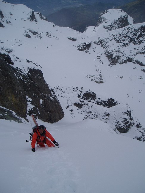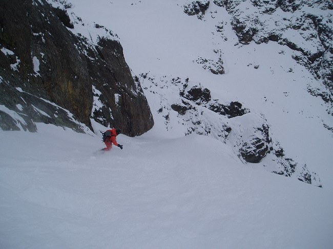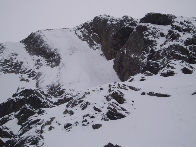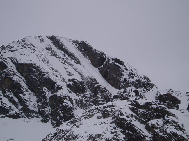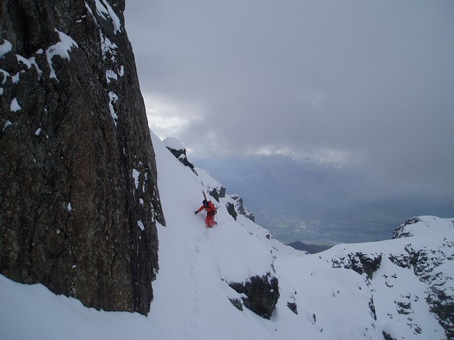 Après avoir failli renoncer à cause des nuages qui nous cachaient la face on a bien fait d'insister ça c'est éclairci et c'était vraiment à saisir aujourd'hui. Seuls les derniers mètres étaient un peu compliqués à la montée avec 5cm de poudreuse posée sur des dalles (à la descente en passant rapidement ça va). Le reste était vraiment très bon. Notre passage par contre a dénudé pas mal de rocher en haut et de vieille neige glacée, très tendre aujourd'hui mais sûrement plus difficilement fréquentable après un bon regel. C'est très court mais bien joli et puis depuis le temps qu'on voyait cette petite facette en passant dans le coin...