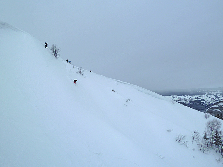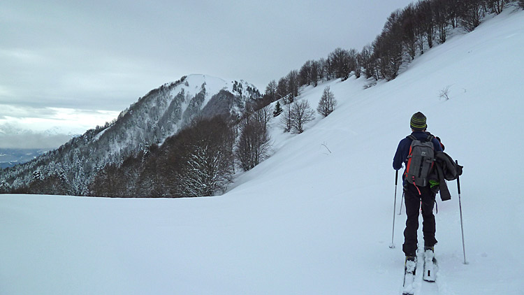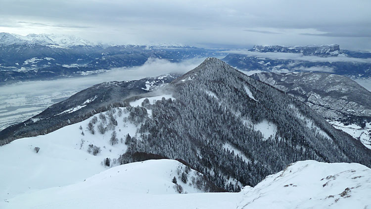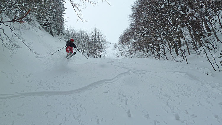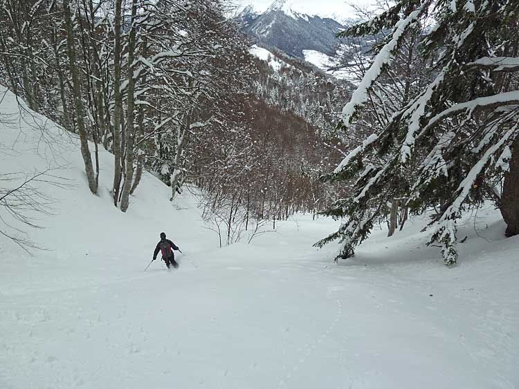 Une sortie placée sous le signe du redoux et qui aurait pu être sponsorisée par l'industrie du plâtre, tant la neige tombée est dense aux abords des crêtes. Presque partis mais pas inspirés pour le versant nord-ouest, David finit de nous convaincre en purgeant la moitié de la face rien qu'en testant la pente planqué dans les sapins... ;-)