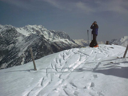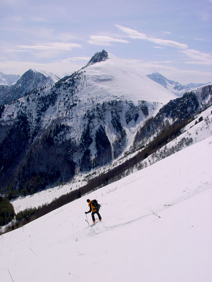 A saisir ! Comme en octobre, une petite chute de neige posée sur l'herbe est suffisante pour voyager et se faire plaisir en tournicotant dans le Beaumont. Neige très lourde avec ski voiture-voiture ; quelques cailloux au pied du versant est du colombier entre 1650 et 1490 m. La fonte a été très importante après la chaleur de dimanche et lundi puisque selon des habitants il était tombé autant de neige ici qu'ailleurs dans le dauphiné : 40 cm à St Michel-en-Beaumont et 70 vers 1800. A noter la perf de Lionel Alleman (LAL) qui fit toute la course avec deux pieds droits. Un 8 (le sien à droite) et un 9 1/2 au pied gauche, celui de Daniel Berthollet oublié dans son coffre après l'euphorie de la poudre à l'aiguille d'Olle (course 02-135). Bien entendu le réglage de la Tri-step ne fut pas suffisant. Solutions : 1. disposer d'une clé BTR (elle fait depuis cette saison partie de mon fond de sac) . 2. Monter avec cale. 3. A la descente placer la chaussure à plat puis rapprocher au maximum la talonniere afin de coincer la chaussure. Ca tient à peu près sur neige dure, mais dans la grosse soupe, compter sur un peu de telemark.