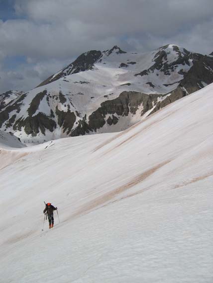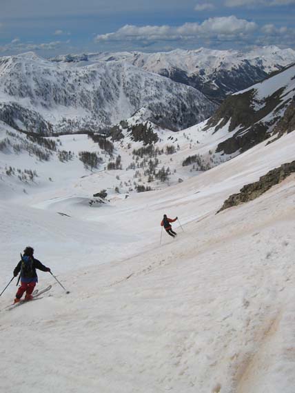 Montée couloir ouest puis arete nord des garrets -> descente au plan du laus 2100 par ravin de meouille->montée au pas du lausson par lac d'allos->descente ouest en retraversant deux croupes (+40 m x 2) pour rejoindre intineraire de montée vers 2300 M