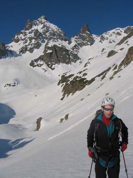 Ce chemin forestier au sud du Rivier d'Allemont est incontestablement un bon plan (Les branches d'un arbre tombe vers 1340m chatouillent energiquement la carosserie: une petite scie utile pour celui que ca rebute.). On se gare donc vers 1400m et l'itineraire est bien rapide (plus que ne le laisserait supposer la carte). On contourne rive gauche le lac de la Balmette et l'on rejoint le pied du neve Pelissier vers 2480m par un petit couloir evident. (A noter un autre couloir NE, bien tentant qui debouche bien plus haut, vers 2740m sur le neve Pelissier . Il semble plus raide que le neve Pelissier)