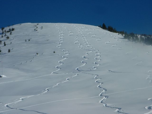 De la poudre légère à tous les étages, juste du soufflé sur les crêtes. Par contre c'est royalement bien soufflé sur toute la face sud de Chapotet en face. Dans les infos du jour surprenant le peu de neige dans la NO des Gds Moulins.