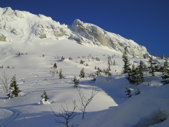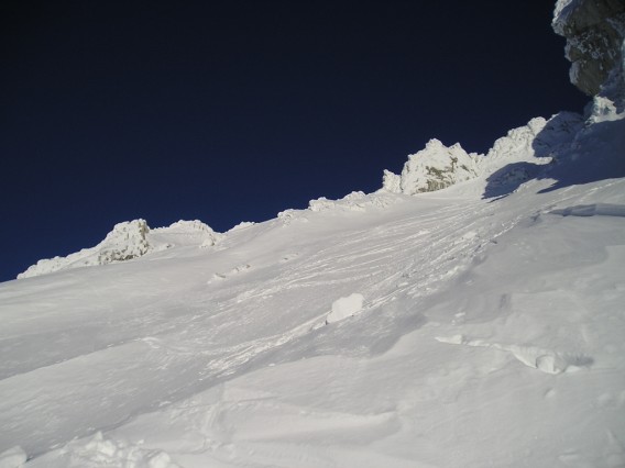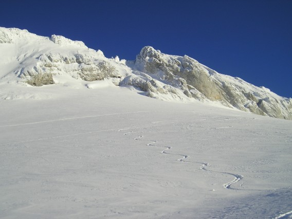 La poudre est encore bien bonne en versant W en choisissant bien les zones non matées par le vent. Lumière du soir très sympathique et jolie course rapide à faire (2h de montée)