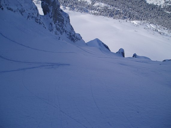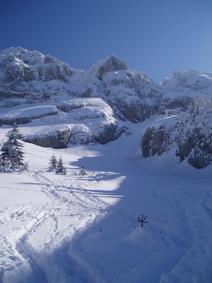Ensemble de l?itinéraire encore poudreux, seules les talus ou contres pentes sud ou sud ouest commencent à croûter. Quelques coulées de purges (datant de la veille) venant des falaises ouest.