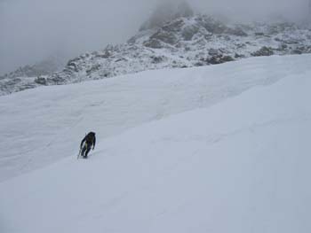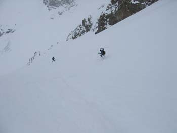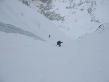 De la neige dès que l'on monte dans le glacier long,on skie du haut en bas dans une pente homogène,la partie la plus pentue est sous le "reste" du premier sérac,une descente agréable avec une neige facile faussant donc la Cotation 5.2 de volo.