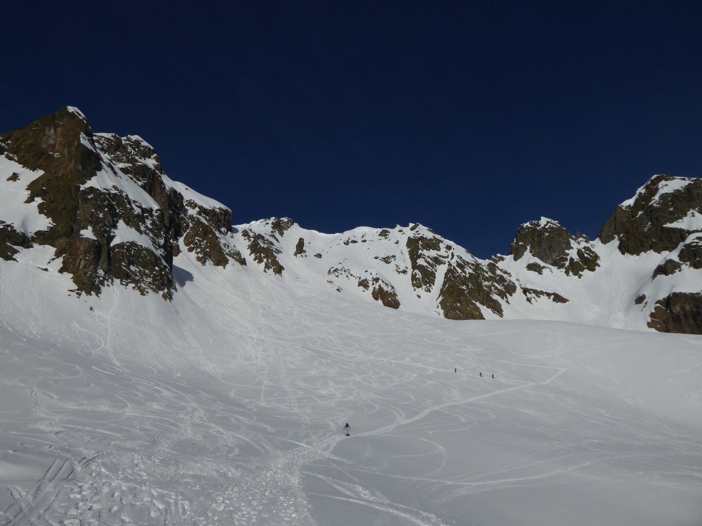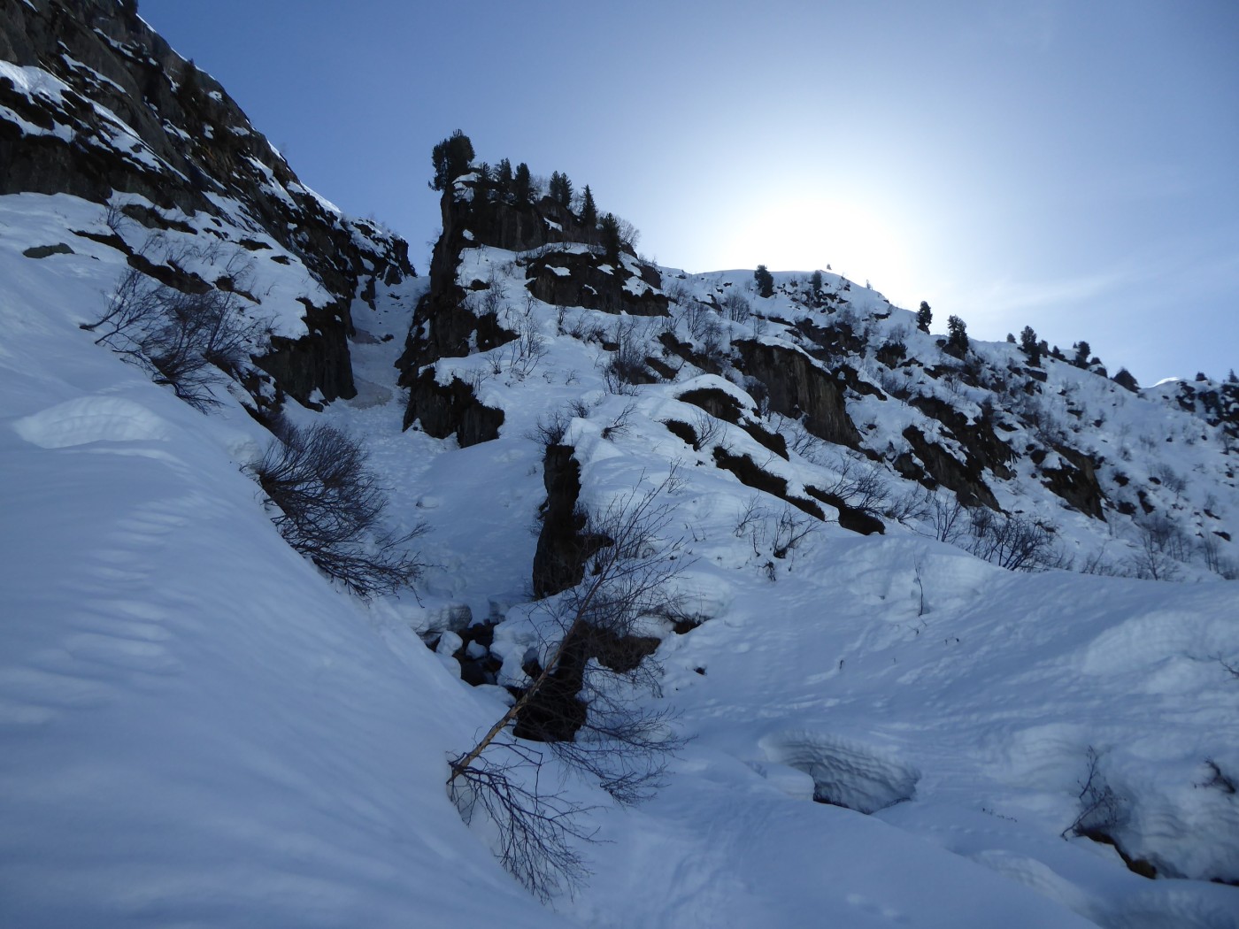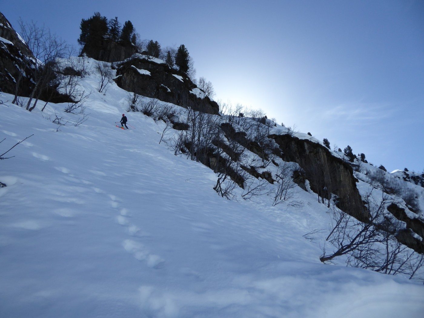 Conditions presque printanières. {{[Comme la saison dernière->https://www.volopress.net/sortie6211.html]}}, le ravin en bas de la combe du Pouce ne passe pas, ça passe bien par les pentes en rive gauche mais la neige est dure. On skie encore jusqu'à la buvette de la cascade de Bérard. Un déchaussage pour franchir un bras de l'Eau de Bérard et deux autres passent en gardant les skis par une enjambée.