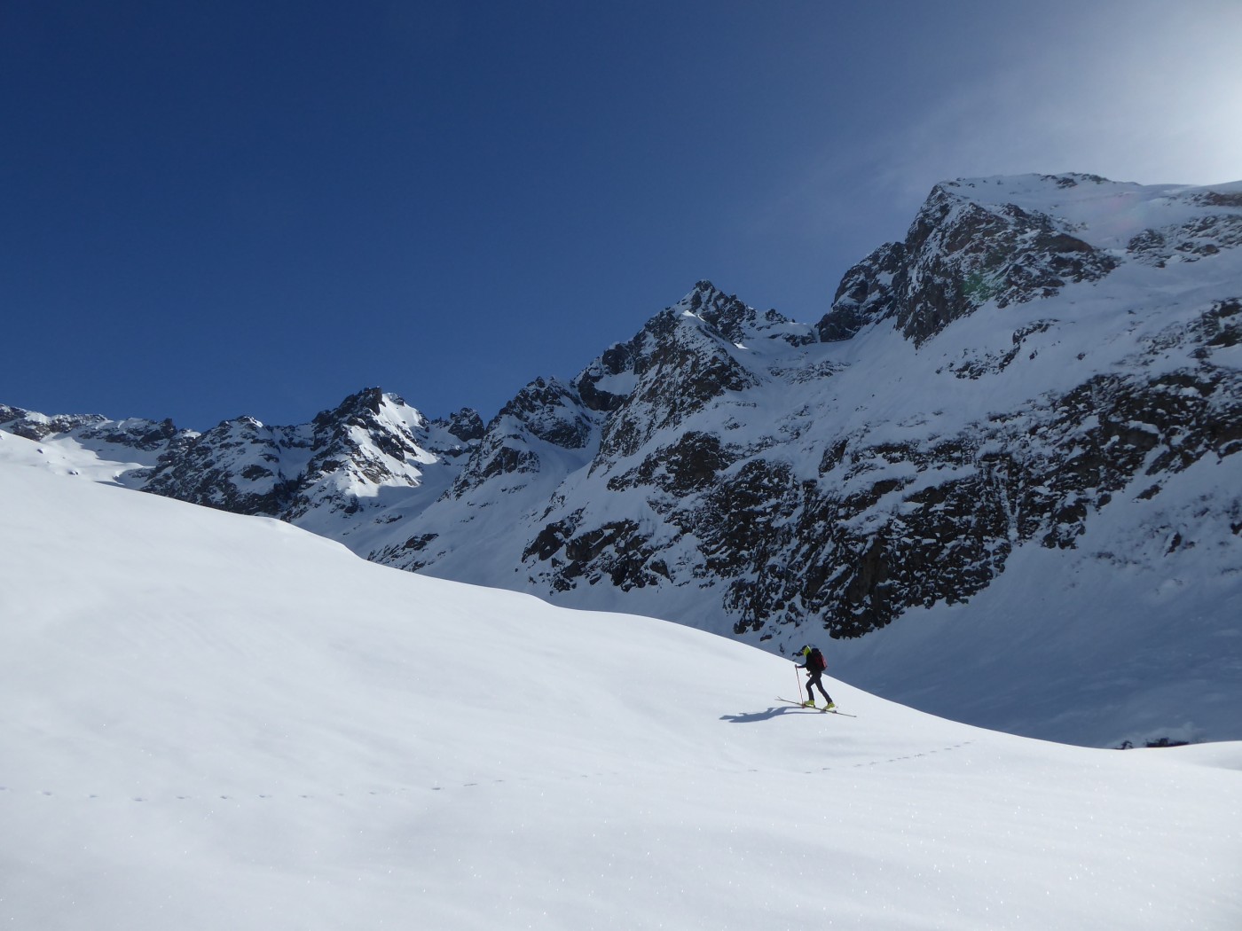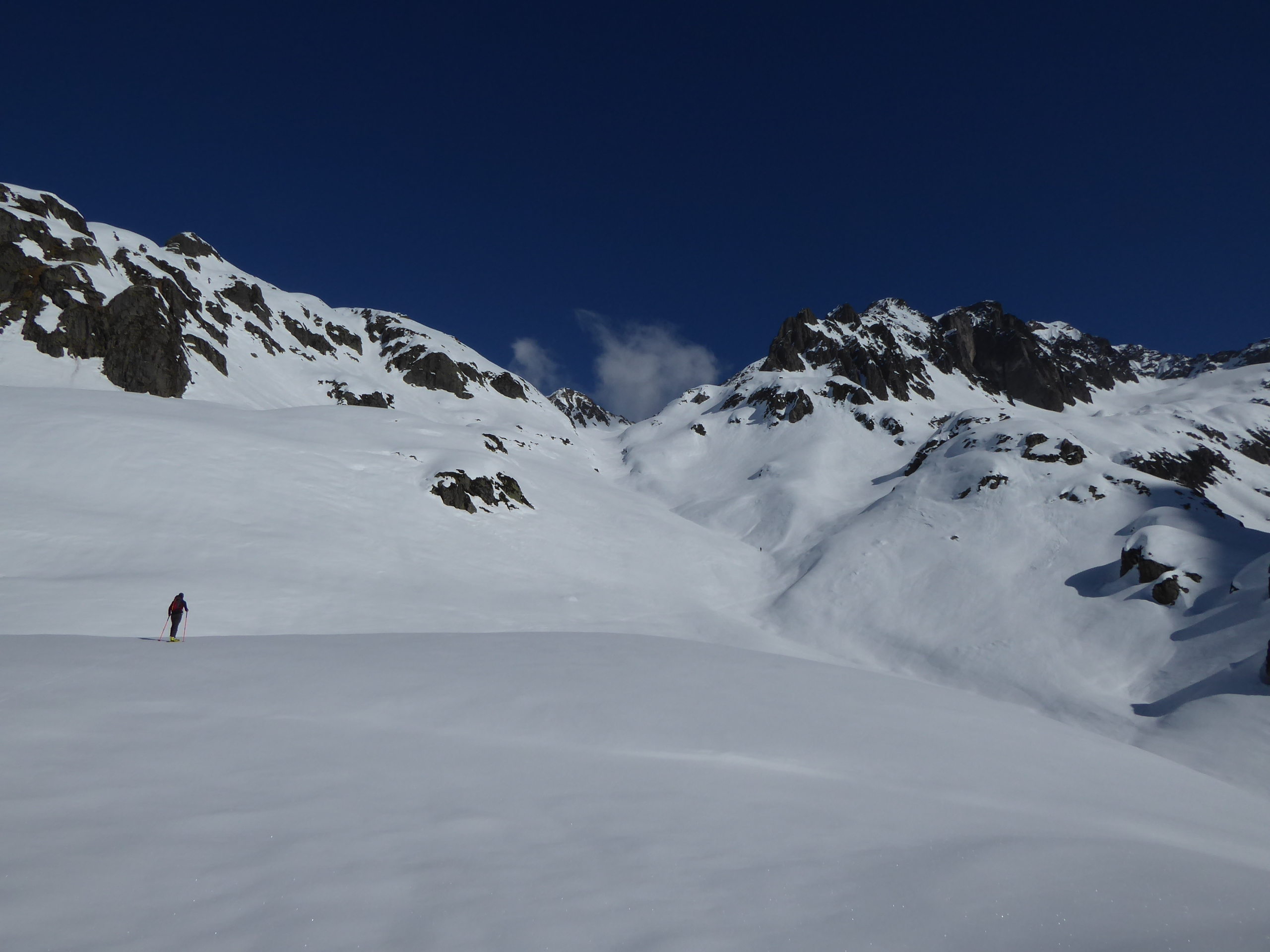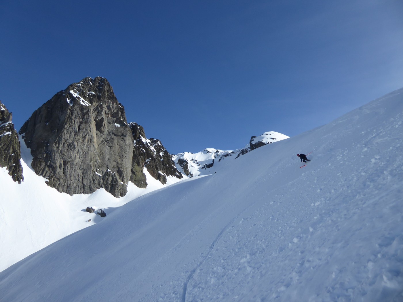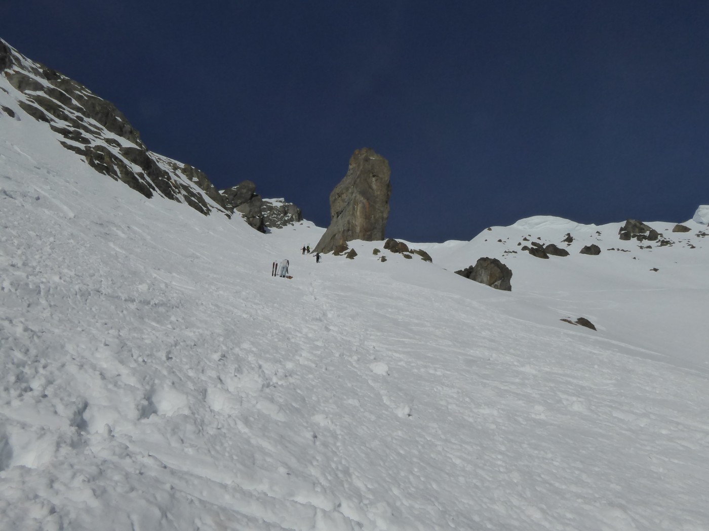 Conditions presque printanières. {{[Comme la saison dernière->https://www.volopress.net/sortie6211.html]}}, le ravin en bas de la combe du Pouce ne passe pas, ça passe bien par les pentes en rive gauche mais la neige est dure. On skie encore jusqu'à la buvette de la cascade de Bérard. Un déchaussage pour franchir un bras de l'Eau de Bérard et deux autres passent en gardant les skis par une enjambée.