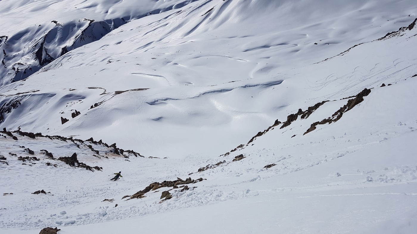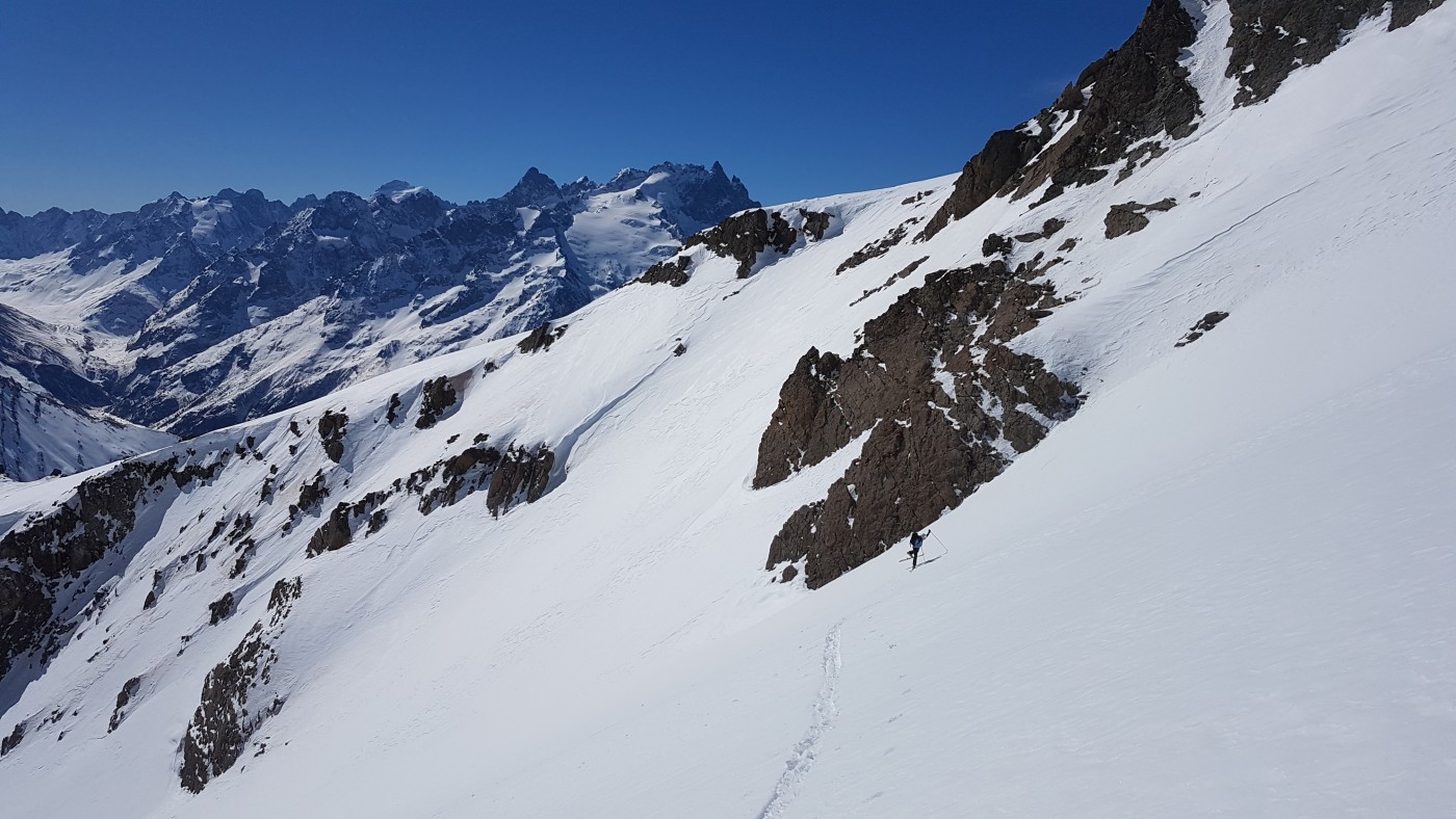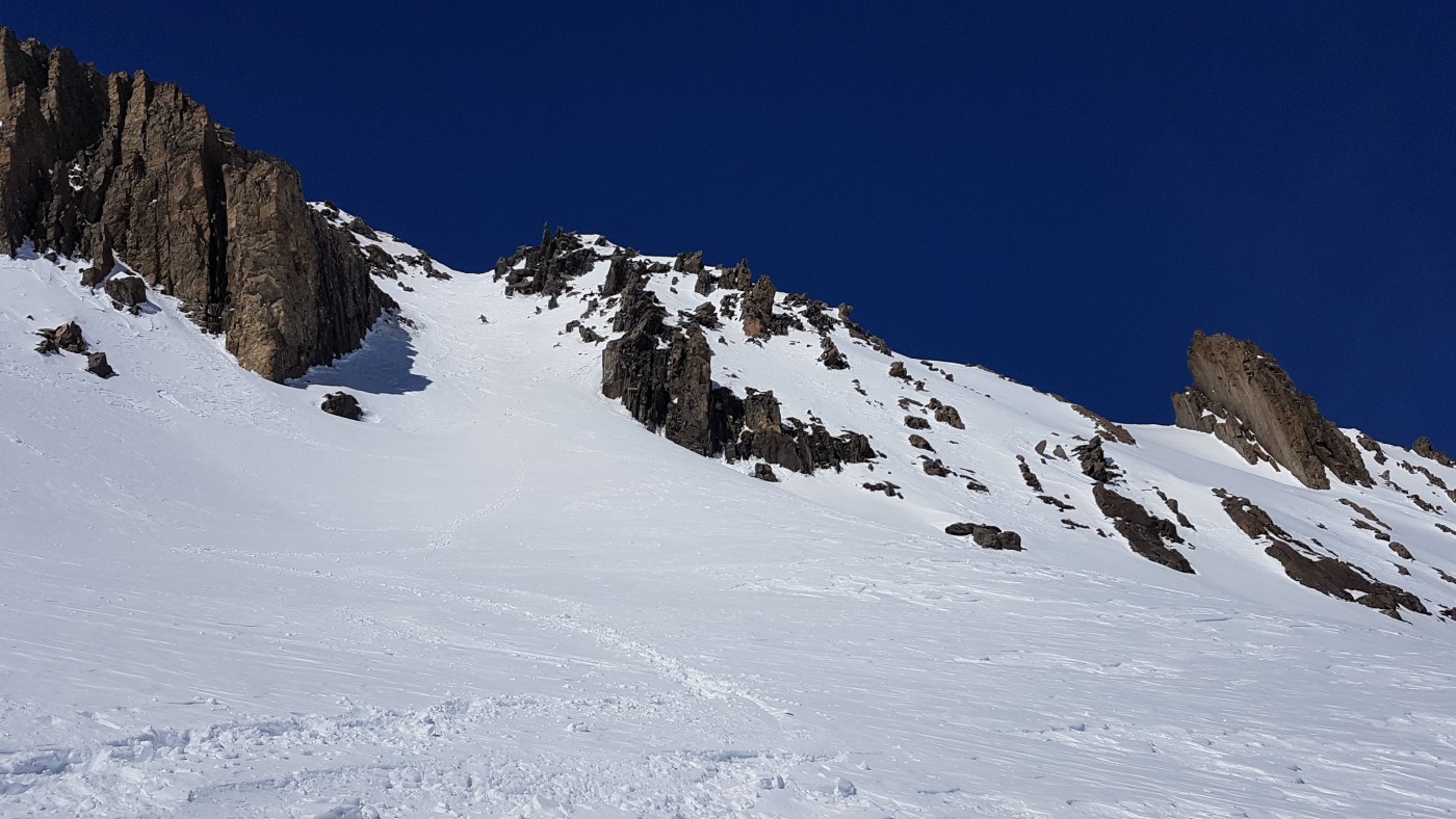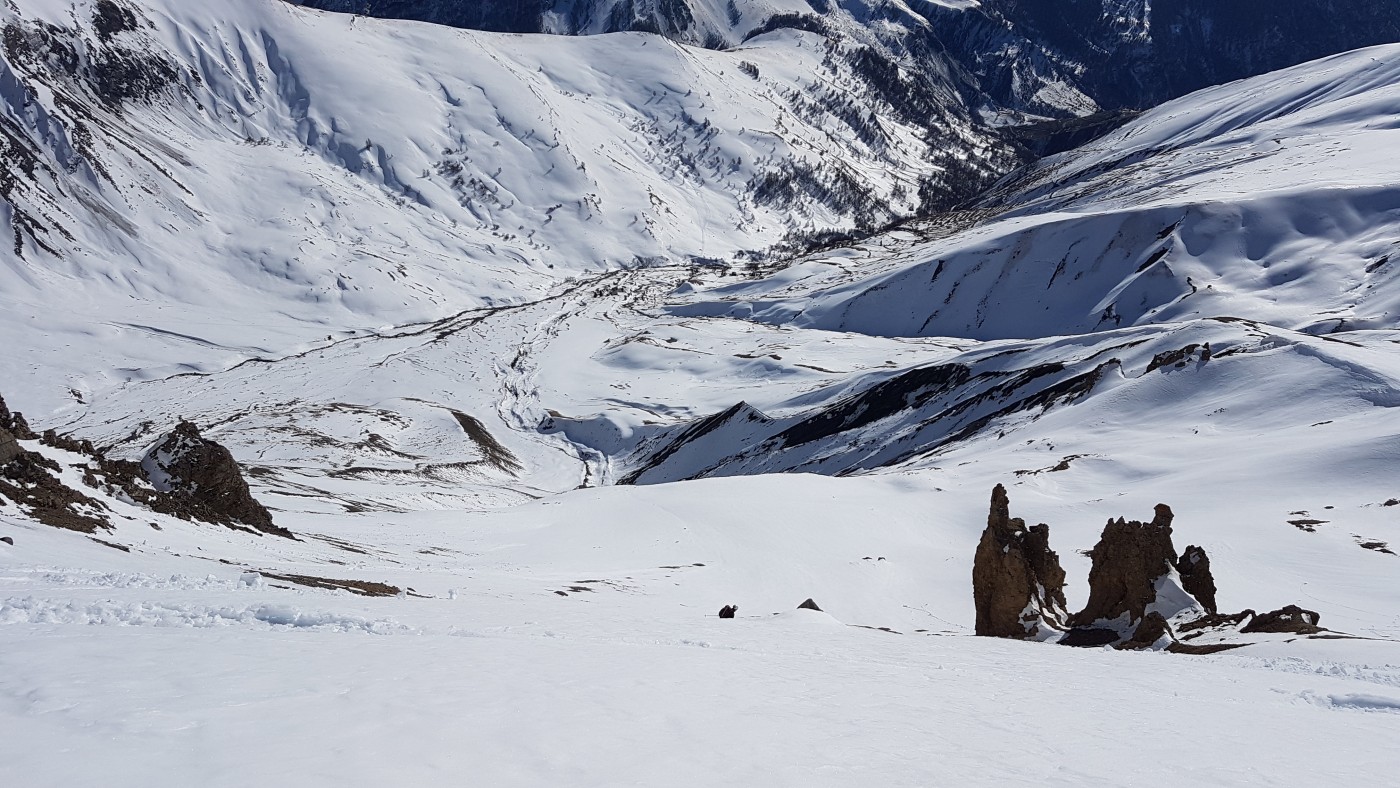 A saisir avant que l'approche ne soit remise à sec, l'enneigement sous 2500 n'a pas grand-chose à voir avec Belledonne. Skiabilité d'ensemble très correcte, quelques rares zones cartons seulement. Pour le retour, ous sommes remontés à la Roche de Casse pour nous convaincre que le couloir sud n'était pas accueillant (remplissage bof, relief..) et on lui a préféré les pentes de Chasse en transfo bien revenue, il faut bien aller chercher RD pour trouver une sous-couche.