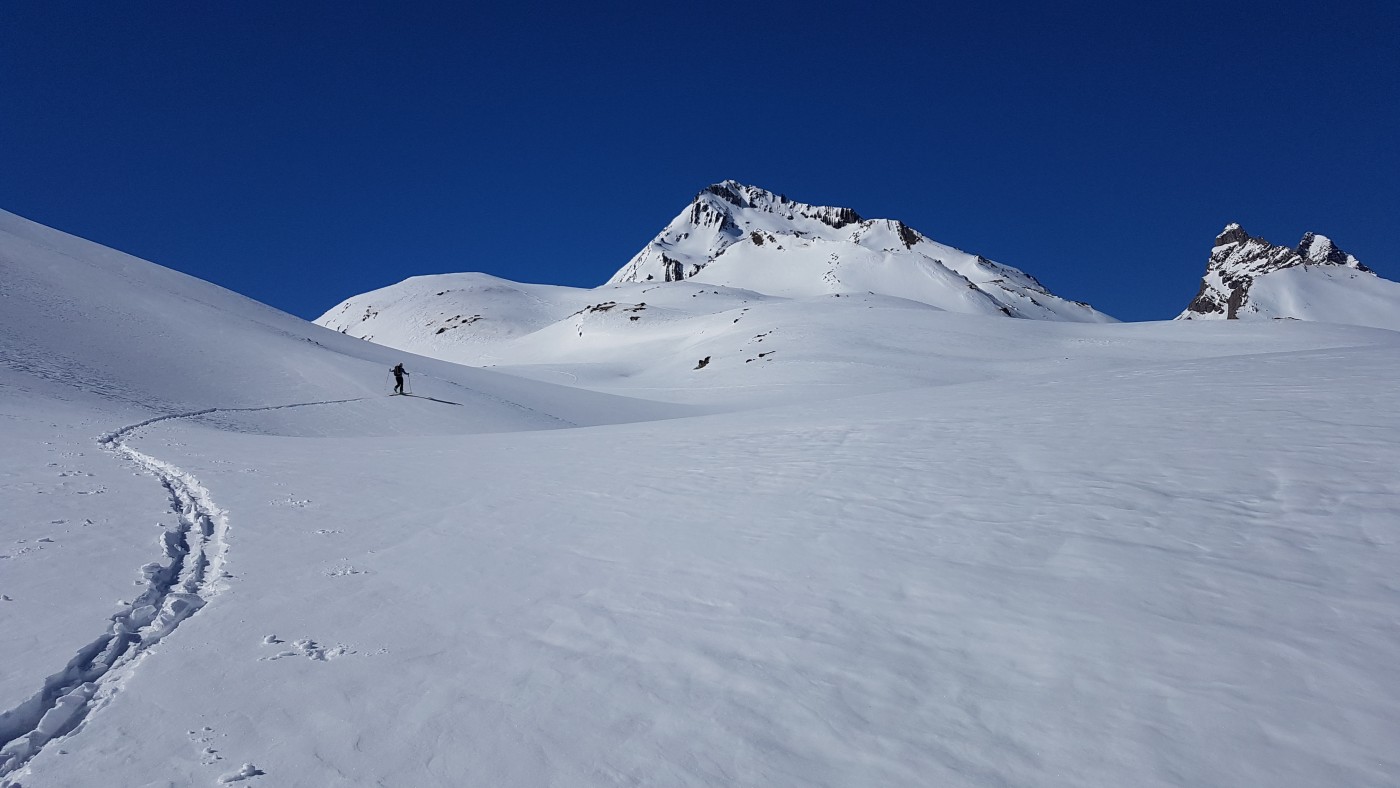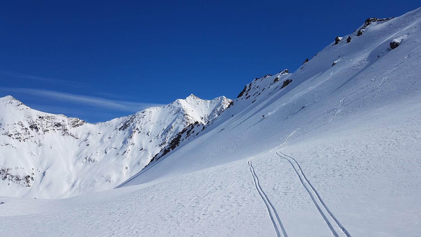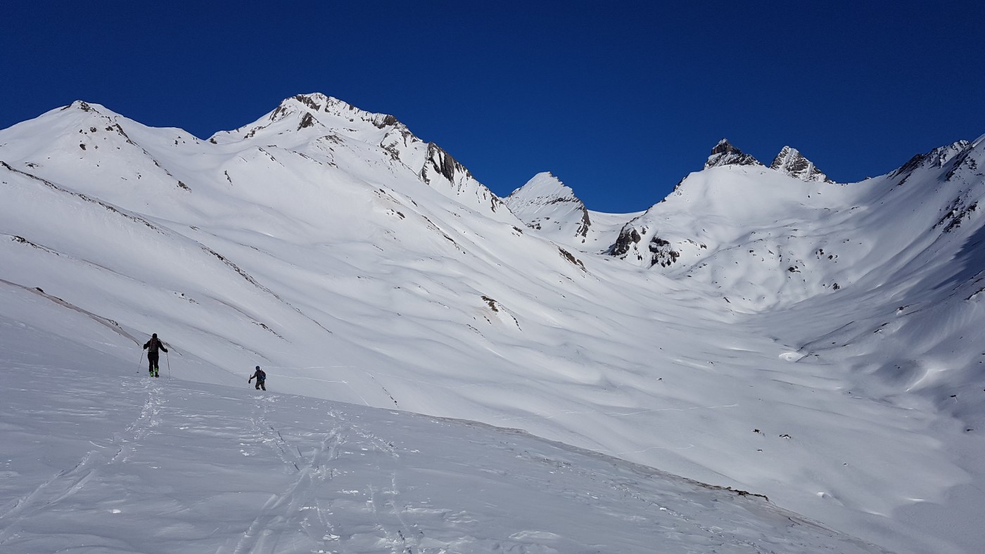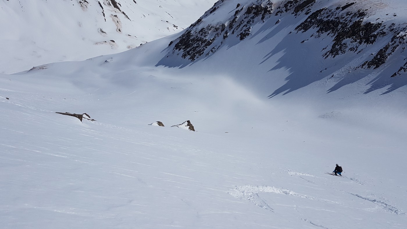 A saisir avant que l'approche ne soit remise à sec, l'enneigement sous 2500 n'a pas grand-chose à voir avec Belledonne. Skiabilité d'ensemble très correcte, quelques rares zones cartons seulement. Pour le retour, ous sommes remontés à la Roche de Casse pour nous convaincre que le couloir sud n'était pas accueillant (remplissage bof, relief..) et on lui a préféré les pentes de Chasse en transfo bien revenue, il faut bien aller chercher RD pour trouver une sous-couche.