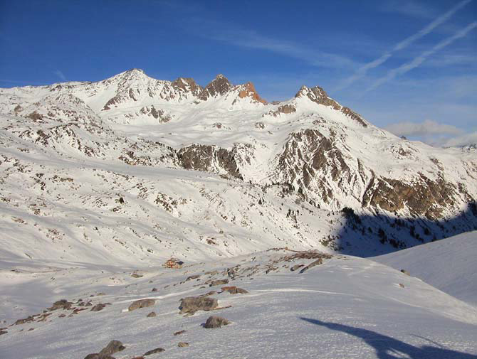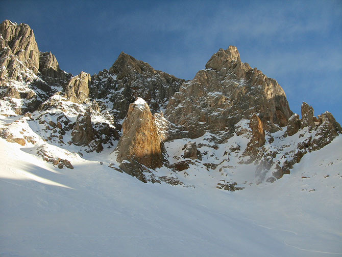 Le couloir est correctement rempli, un passage étroit vers 2850 m shuntable en rive droite (attention aux pierres). Le vent a bien soufflé depuis la semaine dernière et a viré pas mal de poudre en haut.