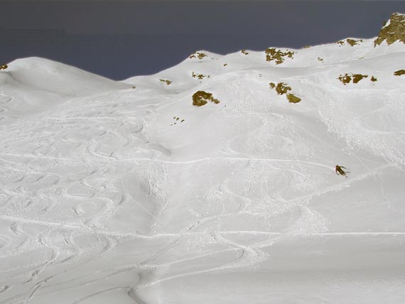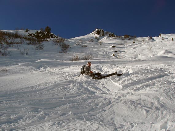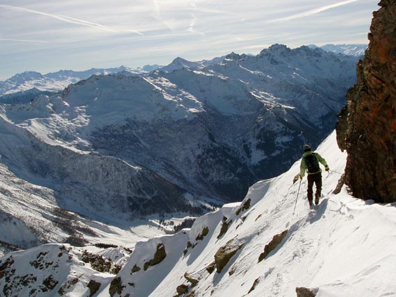 montée le long du ruisseau du lac, on atteint le sommet en longeant l'arête ouest. On est redescendu par la facette nord-est (en poudre bien froide, mais pas des tonnes de neige) afin d'atteindre un petit couloir bien visible à la montée (neige croûtée).