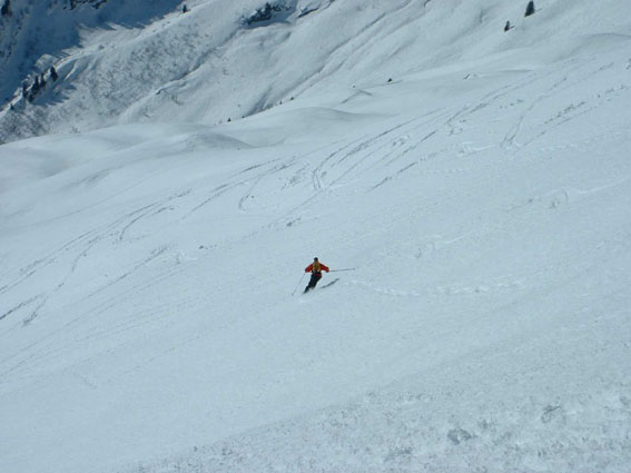 Grande classique du coin , on s'en aperçoit tres vite, avec l'affluence qui suivra sur l'itinéraire normal. On relevera deux groupes de plus de 20 qui se suivent en ordre de marche , sans compter tous les autres. Notre option de la face sud sera le bon plan du jour : pas un chat , une bonne pause et on attaque la descente à 10H30 sur une neige transformée sur les quelques centimetres de surface , qui rappelle ce qu'est le ski de printemps. Du coup de haut en bas c'est le pied intégrale sur cette neige de velours. Un peu plus tard, un petit passage , involontaire, dans le ruisseau du bas au niveau du passage du pont (1274) et on retrouve la voiture. Une grande matinée de ... printemps. Du monde également sur le versant Bellacha.