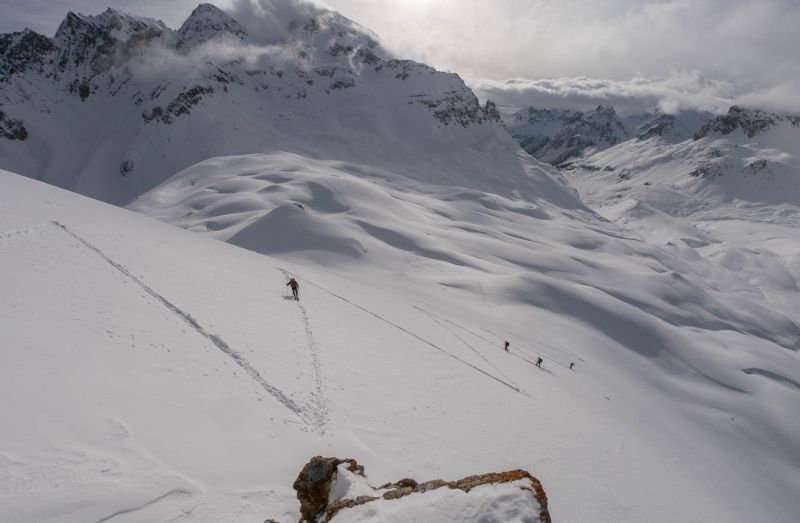 J1 : Grand Argentier (face est en AR d'abord puis remontée et traversée) puis descente jusqu'à Fontaine froide puis remontée au refuge du Thabor et pente nord de la croupe qui descend à l'est du Cheval Blanc pour finir la journée.