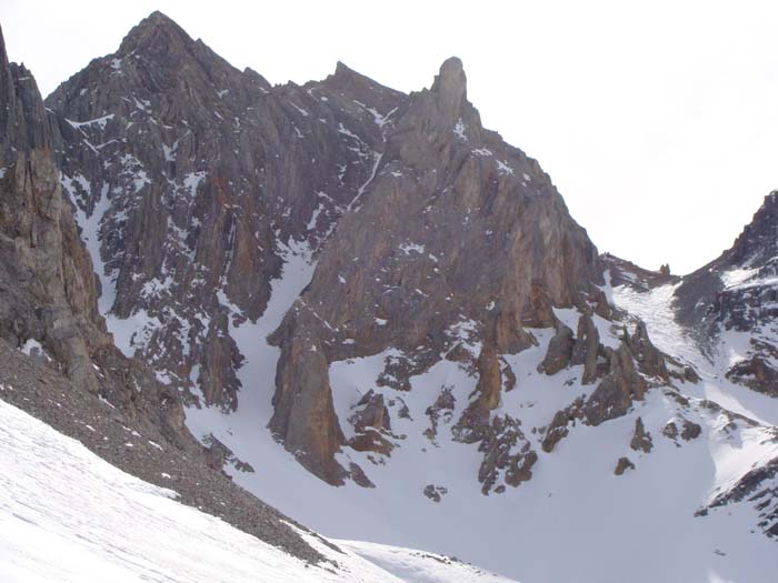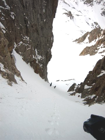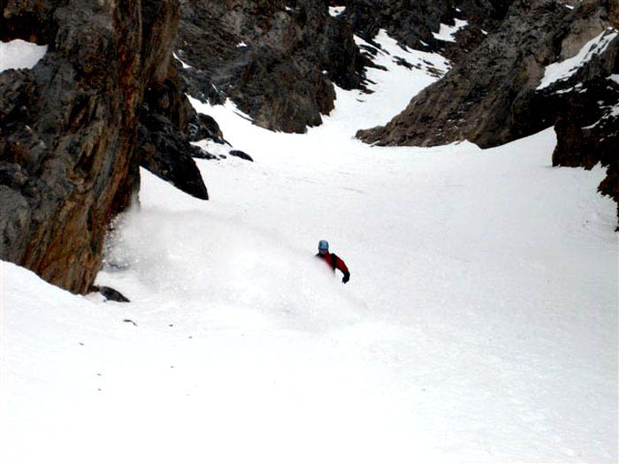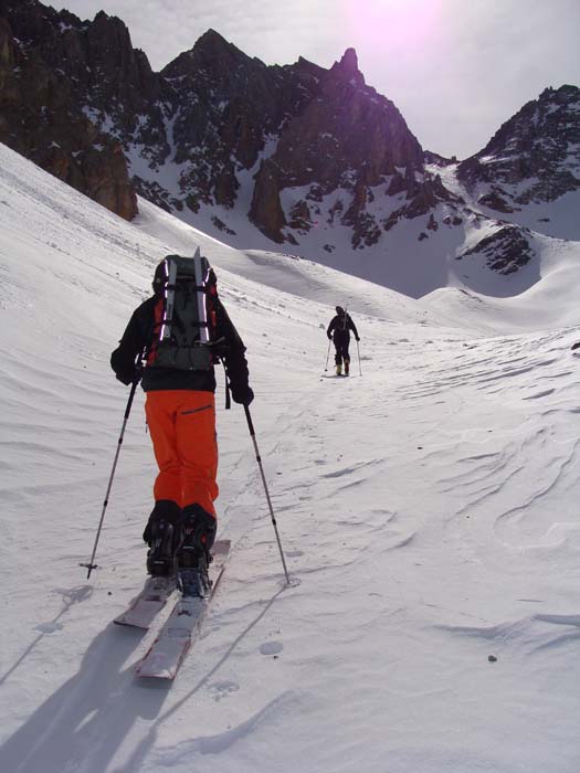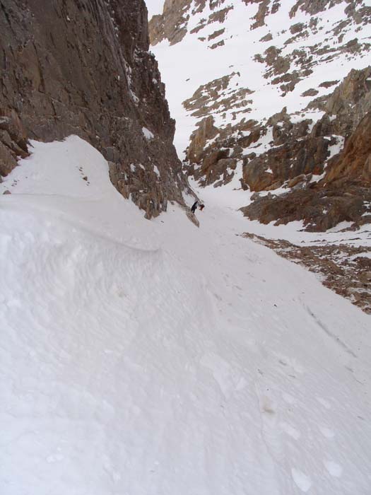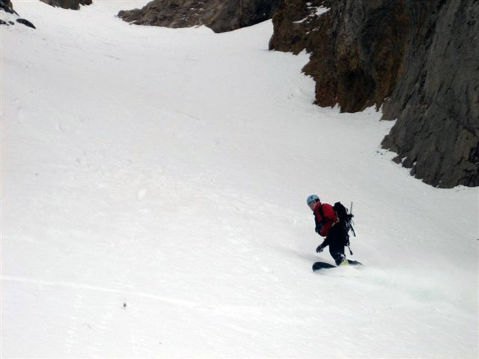 Partis avec l'espoir de trouver de la bonne neige au dessus de 2400m, en visant ce couloir nord, Ludwig avait bien émis des doutes sur le remplissage étant donné le fort vent de la semaine précédente. Pourtant, même au pied Eric et moi espérons encore que le couloir soit rempli dans sa partie supérieure pas encore totalement visible. Malgré le parpinage dès le pied du couloir, je suis motivé et ne vois pas le danger, je prends le relais à 2800m, obstiné je poursuis jusqu'à 2950m, le haut ne passe vraiment pas tout sec, une dernière photo et là, "craquement" je lève la tête et vois plusieurs "parpaings" se décrocher et rebondir, l'un d'eux me tapera l'avant bras, les autres iront frapper Eric et ludwig (mollet, casques et planches). Grosse frayeur mais surtout, grosse erreur de ma part : pas compris le risque pris. On s'en sort bien, avec de gros hématomes.