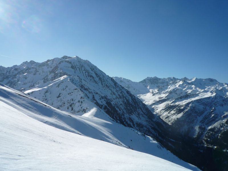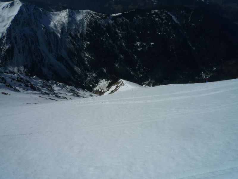 De loin la face Ouest parait un peu ruinée,avec des coulées de neige lourde dans les différents couloirs qui strient la face.Mais cela n 'altère en rien la qulalité de la descente.