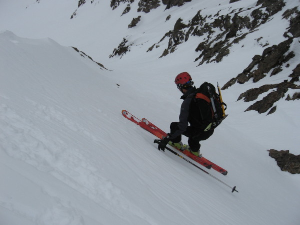 C'était une sortie pour voir: on a vu...Sous le col 2459 un beau vestige de départ de plaque laissant apparaitre la croute verglacée de Janvier qui fait un superbe plan de glissement. Nous avions dans l'idée de faire le couloir J14.1 en apéro: arrivés au pied de celui-ci une bonne accumulation dense type bonne plaque (blocs détachables) ,sur + de 1m d'épais en défend l'accès=> on file direct au couloir SE du charnier. Descente de celui ci en piolet dérapage : croûte transfo glacée portante mais avec un grip limite meme avec des skis neufs! Salop*@!§ de nuages. Petite coupe dans le couloir SE: sous couche transfo humide/ faces planes sans cohésion sur 5cm/ plaque sur 20cm / croute de regel/ poudre sur 5cm/ croute de regel glacée en surface. Bref, c'est pas le top, dès que l'on croise de la neige froide, c'est de la plaque dense et pour la transfo il vaut mieux du soleil