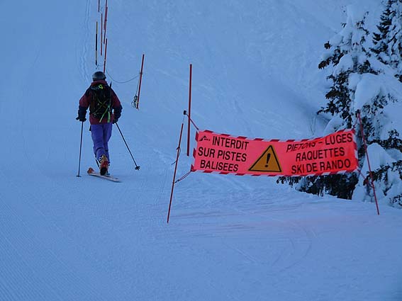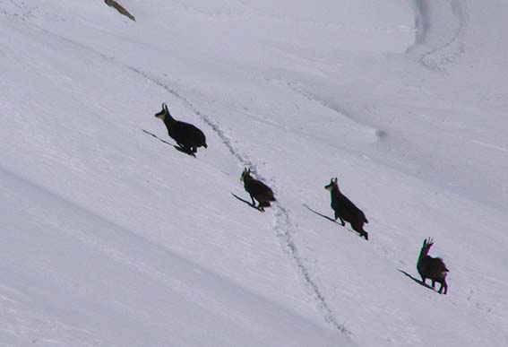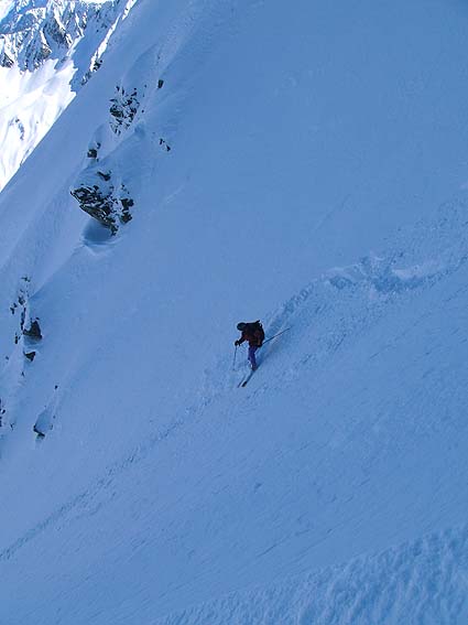 De bonnes conditions tant en qualité de neige qu'en remplissage. A noter que la variante de droite, un poil plus facile semble-t-il et où il y avait un reste de vieille trace, présente un (court) passage rocheux (ce qui n'est pas le cas de la directe). Seuls au monde, avec les chamois.
