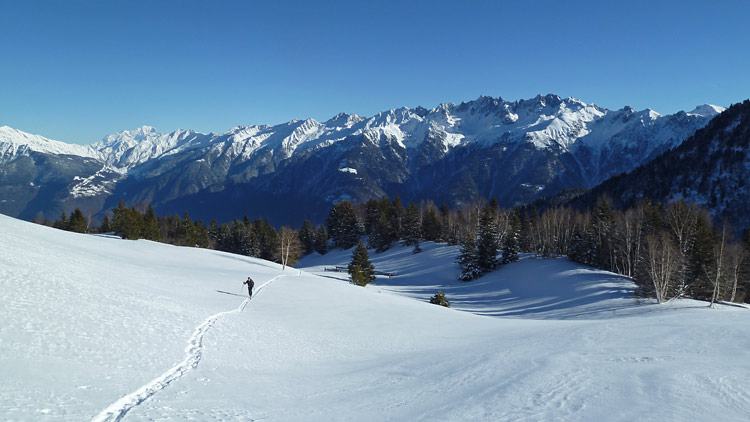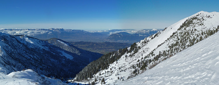 la longue route (pas loin de 6 km) bien plate et ses trop rares raccourcis (surtout avec l'absence de neige sous les épicéas) peuvent émailler l'envie de trainer dans ce coin. C'est vite oublié une fois sur les crêtes avec cette vue atypique depuis la proue du bateau "le Belledonne"... avant de revenir avec un retour bien pousse-bâtons.