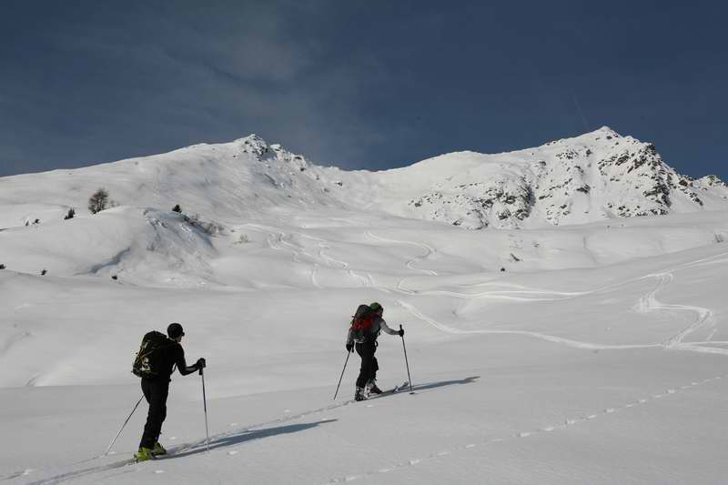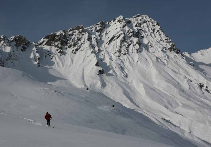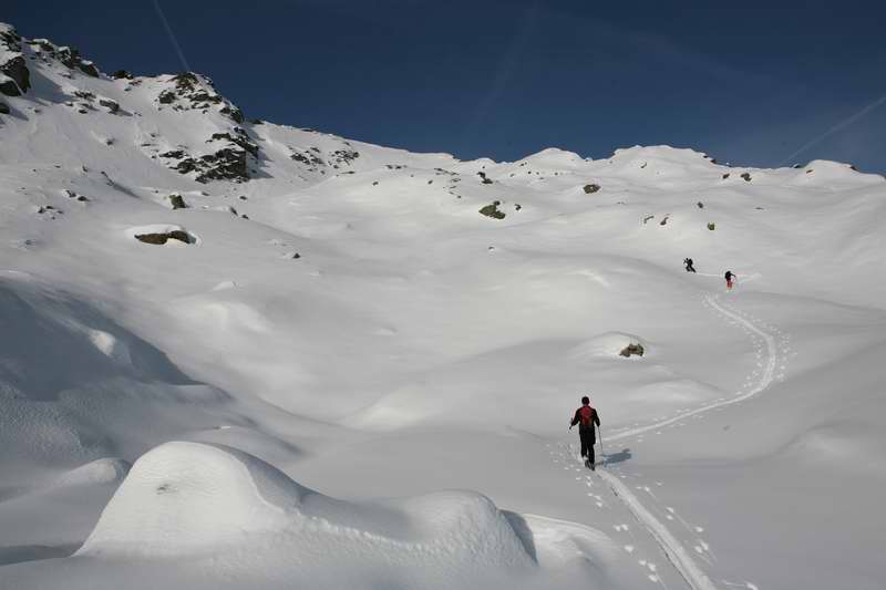 Nous avons tracé tout le long (1200 m en neige vierge à la montée comme à la descente). Plein soleil, neige excellente, pas croisé une seule personne (vu la foule au Mont Rosset ...), grosse plaque contournée au sommet et descente fabuleuse dans une neige onctueuse comme du yogourt brassé ...