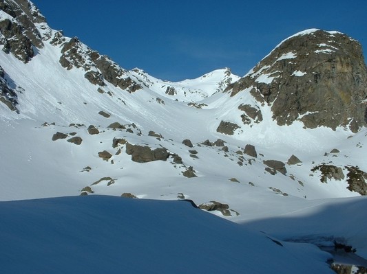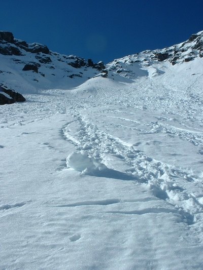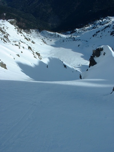 De retour sur mes planches après 1 mois d'abstinence !!! J'ai hésité à descendre par A12, des gars rencontrés au sommet ne l'avaient pas sorti tant ça leur parraissaient merdique (boules/dure/mou/ravagé etc) et s'étaient rabattus sur A13 en sortant par le couloir rejoignant l'arete Nord du Gd Colon , à mi pente de A12. Finalement ça m'a permis de tracer le couloir !! mais c'est vrai que le bas est bien abimé.