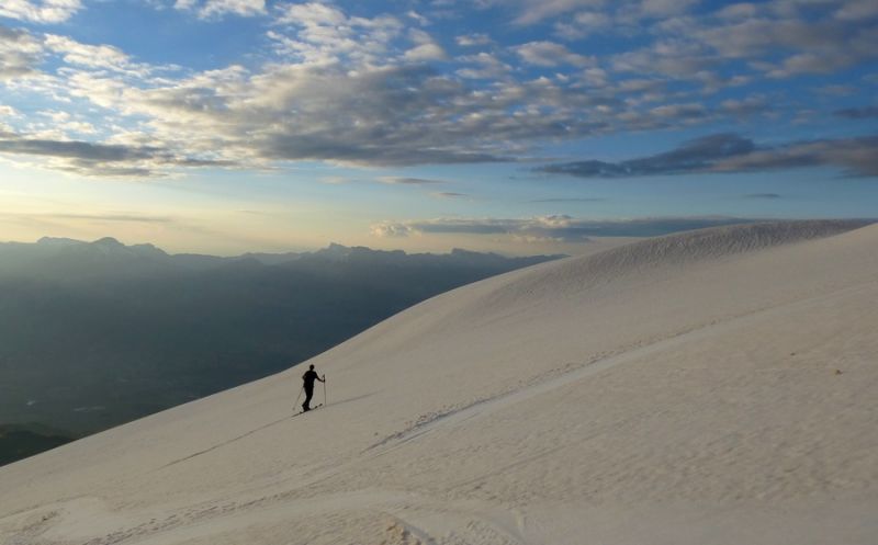 Névé du haut en bas, neige excellente à skier, très lisse avec faible enfoncement.