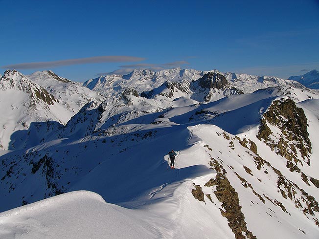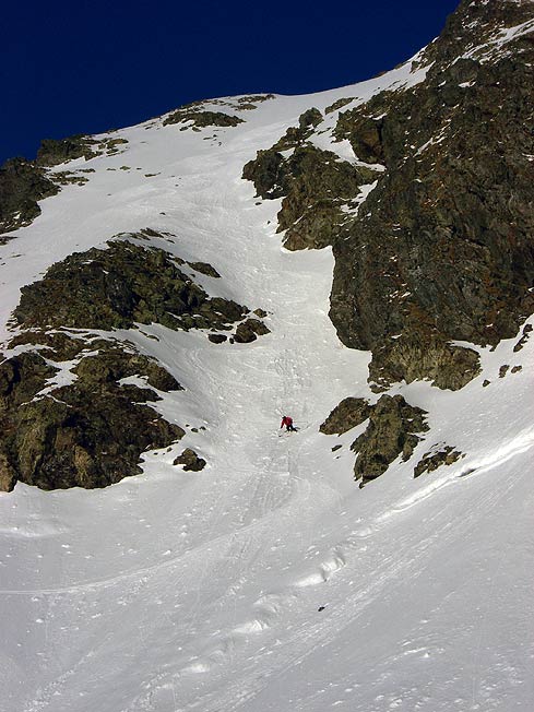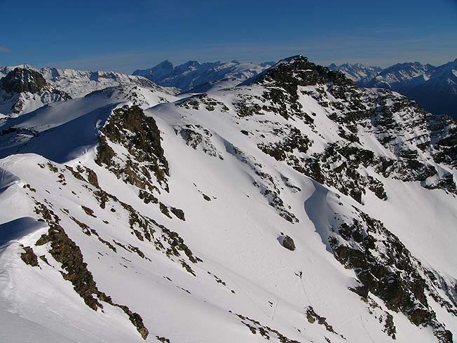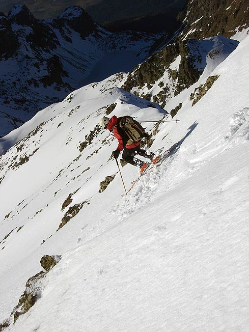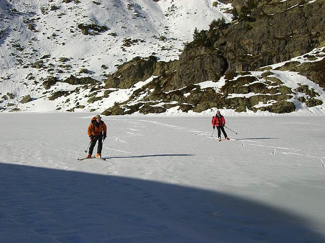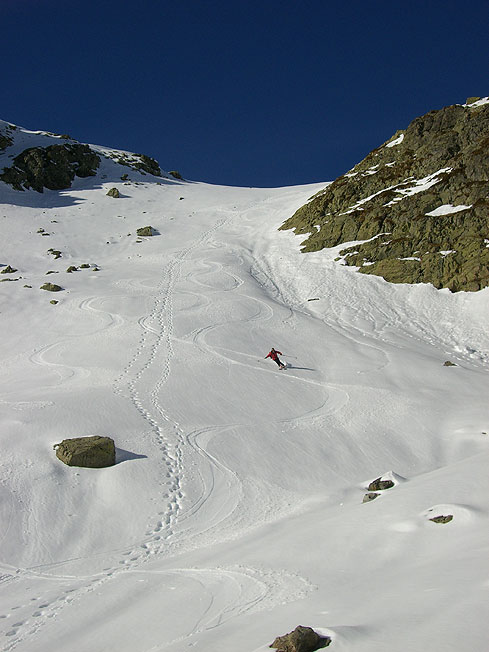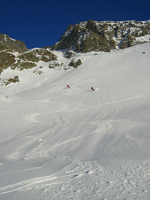 Pas envie de faire de la voiture. Il reste encore des tas de pentes inconnues à portée de main. La montée au Colon est somptueuse par cette arête nord, un peu alpine. La descente sur le lac Merlat est très belle, tout comme la voie classique de la Grande Lauzière : une combe somptueuse haute de 600 m, un vrai bijou. Au passage quelques pentes un peu raides et une neige d'excellente qualité sur tout le parcours au-dessus de 2000m. Sous le lac du Crozet, le retour s'est fait skis aux pieds jusqu'à l'entrée de la forêt (moyennant trois très courts déchaussages) mais c'est très technique (nettement plus dur qu'un 5.4 en poudre) avec des risques de blessures graves en cas de chute sur les (très nombreux) cailloux qu'il faut éviter. Reste que ce fut plus rapide qu'à pieds.