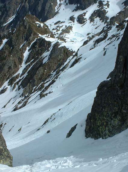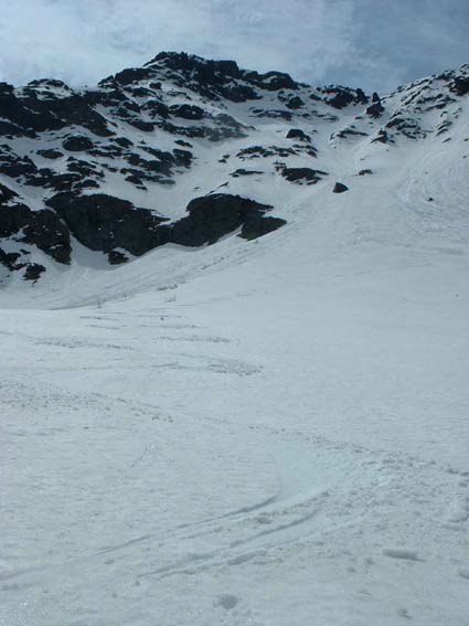 Je savais que ce ne serait pas le top avec un départ aussi tardif et une nuit sans regel. La montée fut pénible , dans le bas c'est la couche superficielle qui se dérobe sous les skis, ensuite faut faire la trace dans une neige pourrie sur 20 à 25cm. Au milieu à 50 m sous le gros rocher qui marque l'entrée du couloir , je mets tout sur le dos . Au moins je monte (!!) mais alors pas vite , on s'enfonce jusqu'au genou, heureusement y a une vieille trace de montée à pied que je transforme par endroit en tranchée. Pour finir cette galere (de montée) , y faut remettre les skis à la sortie de la dent , on s'enfonce jusqu'à la taille... OUF. La descente ... merci les paraboliques, y a qu'a faire fumer et ça part en coulées (sans danger) de partout (ça skie plus vite que ça ne coule ...).