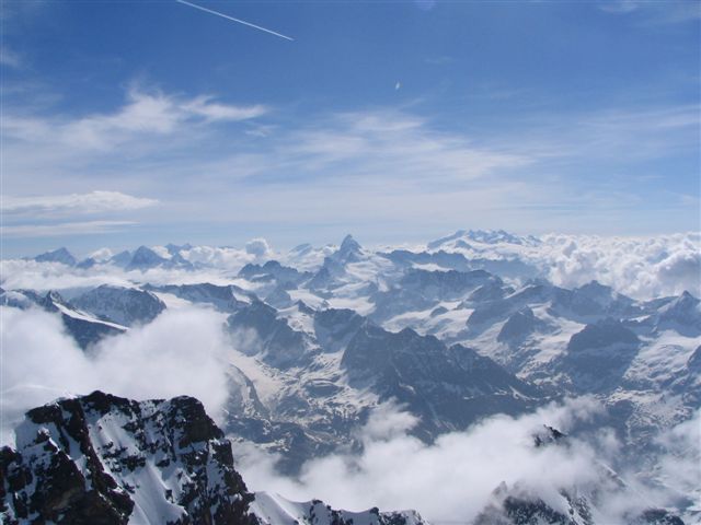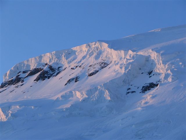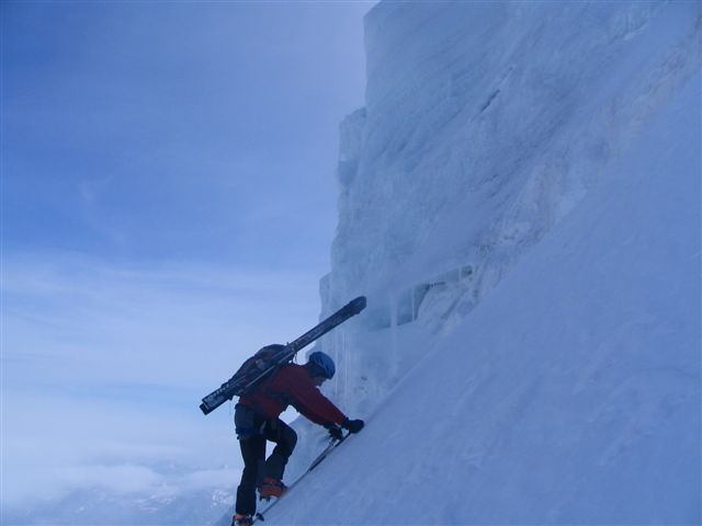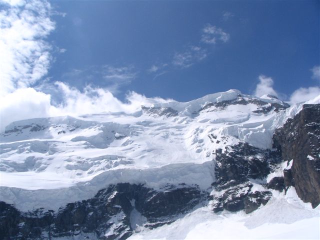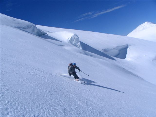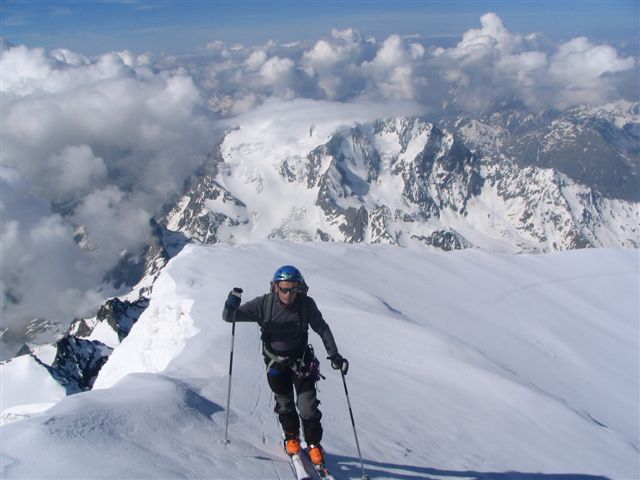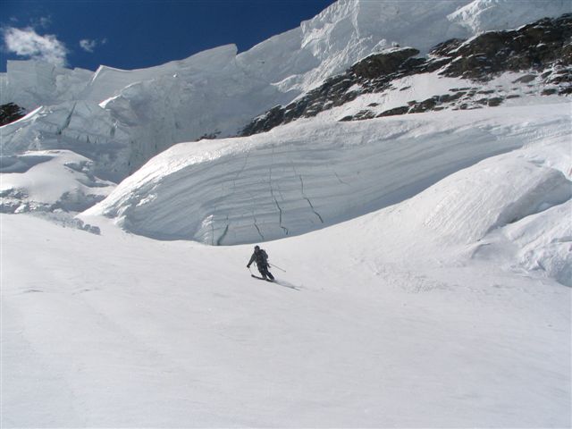 Nous étions seuls au refuge, avec des gardiennes dubitatives sur nos chances de succès : sommet pas fait depuis 1 mois etc... Très belle course d'altitude en conditions optimales ce jour : la sortie du Gardien est facile en ce moment ( 30 m à 45° en neige dure ). L'expo aux séracs est courte ( <5mn ) si on remonte le Gardien par la rive droite le long de l'échine rocheuse. Sommet bien skiable, mur de la Côte ok à ski et glacier bien bouché jusqu'en bas. Les Corridors sont vraiment à éviter à la montée, mais à la descente l'exposition aux monstres de glace est courte. Cerise sur le gateau : portage < 40mn au retour. C'est le type même d'itinéraire où la longueur des glaciers valide l'activité ski / activité alpinisme.