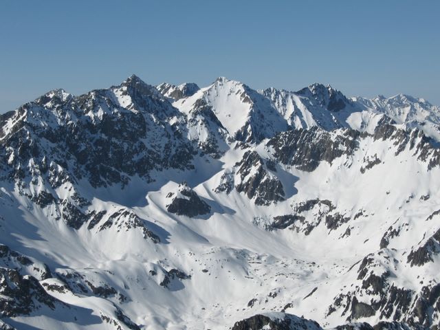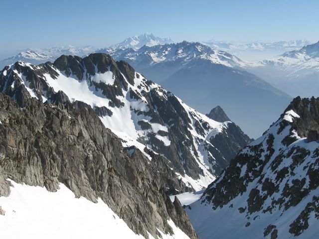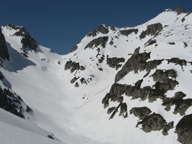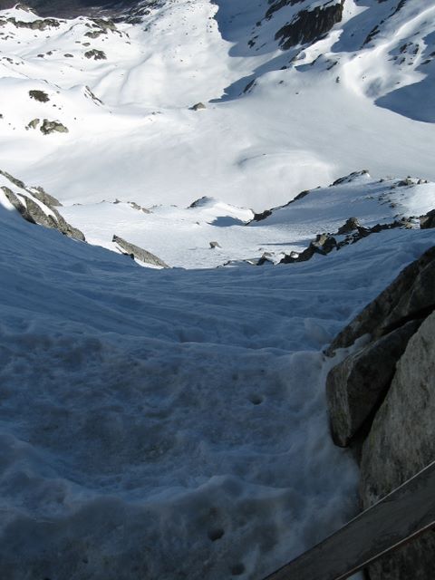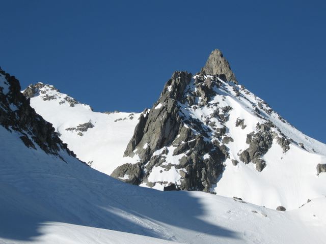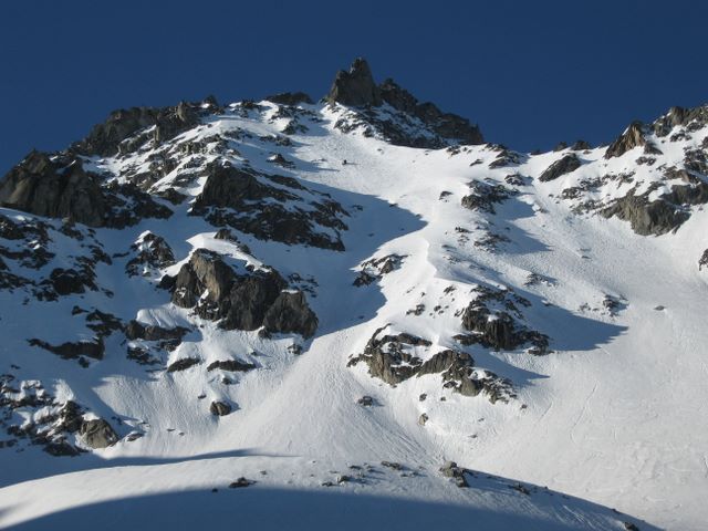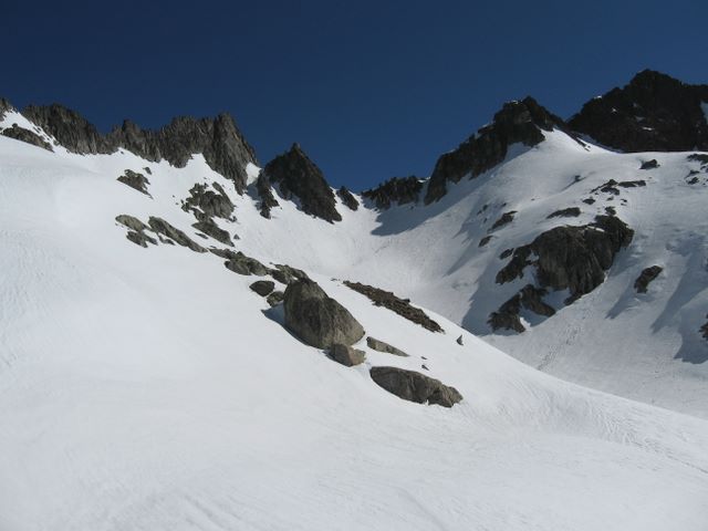 Cette itinéraire ne mérite pas son rang de variante... C'est une superbe boucle qui permet de jongler avec les versants et de skier de grandes pentes sans difficultés, en particulier le retour NE depuis le Col de Crozet, qui est un vrai régal, avec ces immenses pentes intactes de traces et justes revenues. J'étais passé à la brèche de la Nord du Crozet pensant secrètement "me la faire", mais après avoir chaussé et glissé sur 2, 3 mètres pour tenter un premier virage, j'ai renoncé ... les conditions minimales de sécurité (les miennes en tous cas...) n'étaient pas réunies : neige béton sur les premiers mètres, vieilles traces pas appétissantes toutes 'en escalier' des prédécesseurs , carres non affutées, pas de crampons pour deséscalader ... enfin c'était pas bon pour moi.