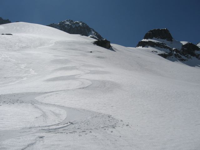 RAs tout est dit. Gràce à un très bon regel et à des températures chaudes mais pas caniculaires c'est du tout bon ... Limite skiée 1600 : il faut lire "limite skiable" tout cours, car il faut une sauvage bataille dans les vernes pour arriver à cette limite basse.
