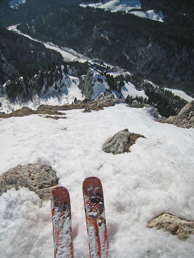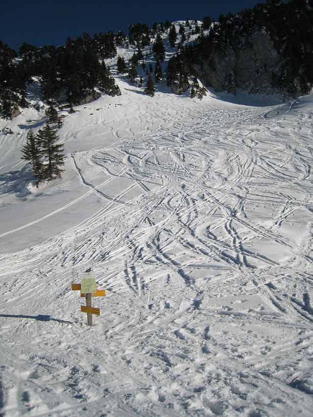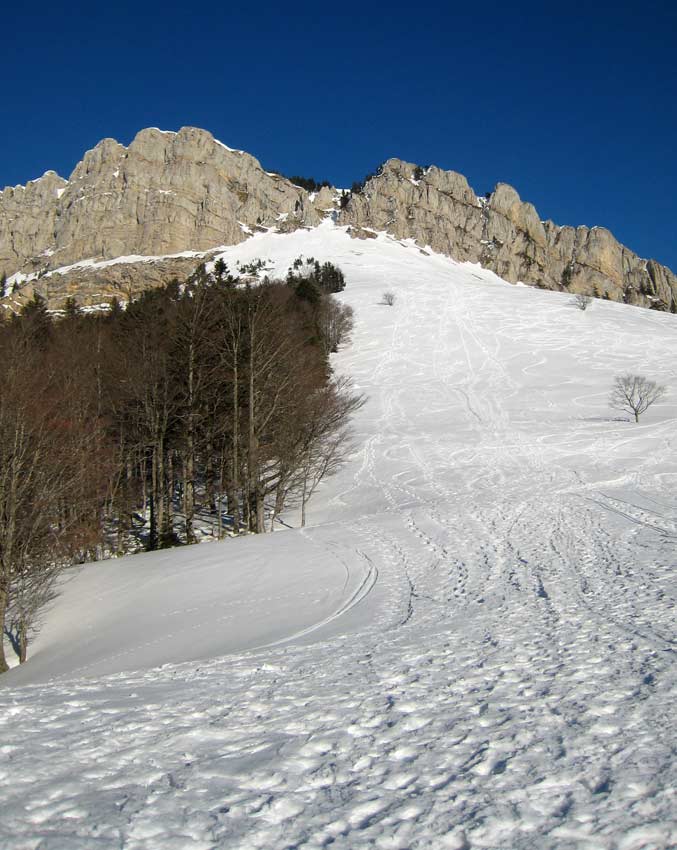 Hors traces la neige est le plus souvent froide au-dessus de 1500-1600 m sauf sous le Petit Som. Mais les pentes peu raides en versant Est du Grand Som sont plus rarement croutées qu'en neige froide tassée.