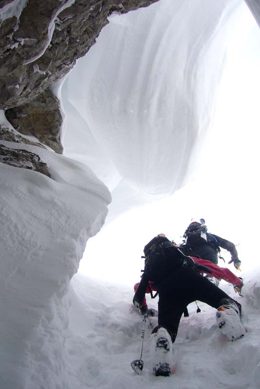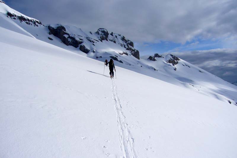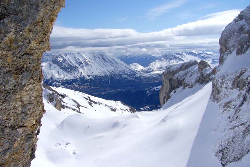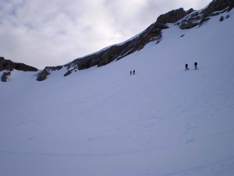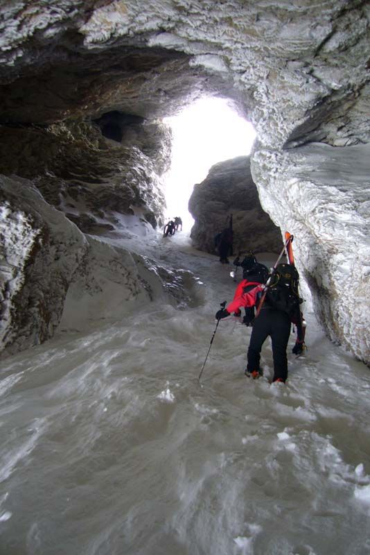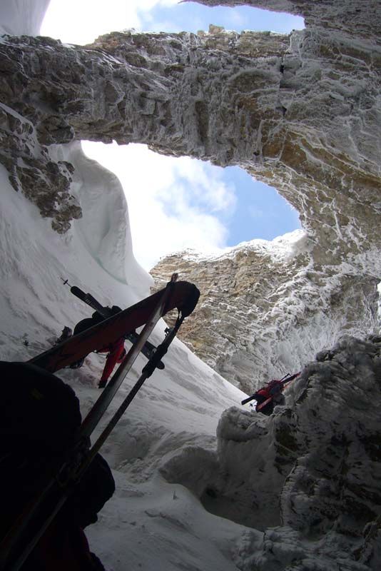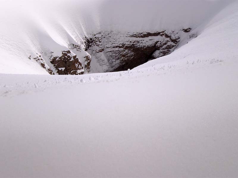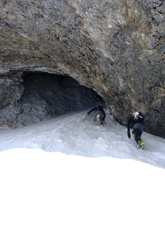 Les conditions sont idéales pour la remontée des deux chourums et de la chatière qui fait suite. Idem pour la pente finale. J'ai eu une toute petite inquiétude dans la traversée entre le premier chourum et le second où on pouvait constater la présence de neige roulée, mais elle n'était qu'à cet endroit. Les traces dans le fond gelé sont bien marquées et les 40 cm de grains fins restent bien en place. Le piolet est quand même utile dans deux ou trois passages décapés. La remontée dans la chatière est bien ludique, et préférable à la sortie par les pentes à droite, mais elle est surmontée par une monstrueuse corniche. À éviter par redoux ou horaire tardif. La descente de la face sud est assez confortable, mais il ne faut pas skier trop près les uns des autres, car on envoie pas mal de neige lourde.