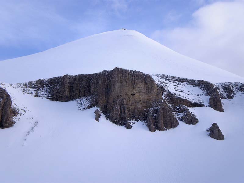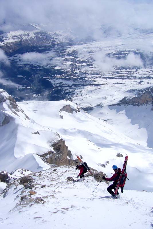 Très belle sortie, à l'invitation de Florent et Sylvain. Nous avions quelques craintes au sujet du regel, car la nuit étoilée avait un peu tourné court. Températures très douces en bas et regel médiocre sous la cabane du Fleyrard. Heureusement, avec un peu plus d'altitude et des pentes bien dégagées, le regel est devenu tr ès bon. De plus, nous avons été épaulés par les nuages persistant dans la matinée et le vent de sud qui s'est levé vers midi, retardant le dégel. Tirés par les locomotives Sylvain et Florent, qui ont tout traçé, la progression a été assez rapide (sommet à 12h30) et nous sommes passés partout à la bonne heure. La descente au-dessus de la cabane de Fleyrard se fait encore assez bien ; après, quelques courts déchaussages. À noter qu'un ami de Sylvain a sorti un brin de corde (30m) à ma demande pour assurer le dernier passage, délicat et très exposé, de l'arête est.
