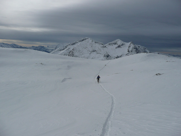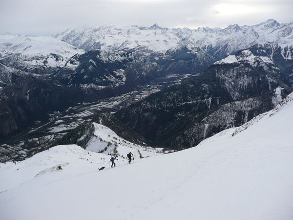 On cherchait le calme, un secteur herbeux pour ne pas tout abîmer, une pente non trafolée et un peu de soleil. Seul ce dernier aura manqué bien qu'il nous ait fait un petit bonjour au sommet. Mention spéciale à Thibault qui, ayant oublié ses peaux, a tout fait à pied. On touche très peu à la descente.