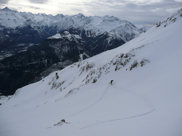 Avec ce ciel voilé et ce temps très doux, les conditions ont changé entre la montée (globalement poudreuse) et la descente qui commençait à être collante sous 1800 m. Au moment où ce compte rendu est écrit, il est probable que les données nivologie soient déjà bouleversées.