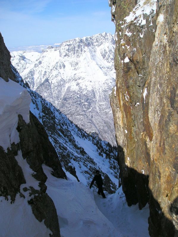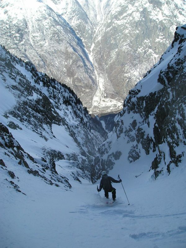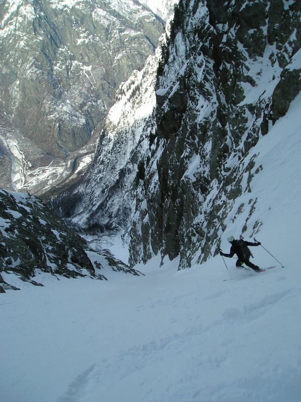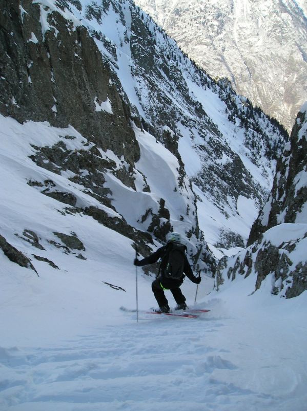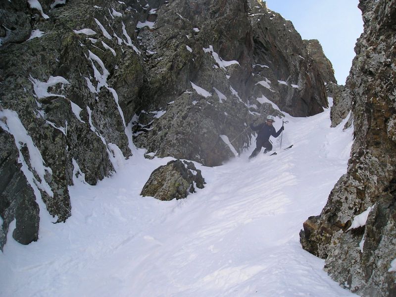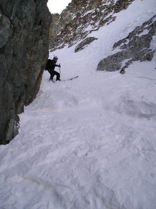 C'était le suspens à la montée. Qu'est-ce que le vent aura laissé? L'entrée de la branche de gauche est barrée par une énorme corniche et la branche de droite est ravagée par le vent. Mais une fois l'étroiture passée, ça a une meilleure tête. Le vent a quand même bien tout travaillé. Pas de grosse poudre, loin de là (rien à avoir avec [celle-ci->http://www.volopress.net/volo/sortie1761.html#pic]), mais une alternance de neige compactée, sûre à skier, de poudre en RD ramenée et densifiée par le vent, souvent physique à skier et au milieu, et bien, parfois c'est bon, parfois il faut faire avec une neige irrégulière. En tout cas, tout est bien stable.