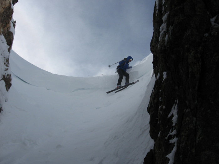 Contrairement à nos attentes, pas de neige fraiche en dessous 2000. Au dessus on arrive péniblement à 20cm à partir de 2200 très tourmentée par le vent de nord-> grain fin très bon à skier. Haut du couloir de l'infernet: branche de droite (vu du bas) => grain fin du au vent remontant le couloir puis accumulation douteuse (plaque à vent) 5m sous le départ-> remontée en escalier direction la branche de gauche. Branche de gauche => saut de corniche pour rentrer (effondrement lors du saut) puis neige froide tassée par le vent (20cm) sur fond croute de regel de plus en plus dure à mesure que l'on descend. => on descend 20m puis on remonte pour revenir le skier en meilleures conditions une prochaine fois. Ça passait certainement mais pas avec du grand ski (surtout sous le rappel: pas de fraiche sous 2000 avec fond bouleux béton = bof bof)