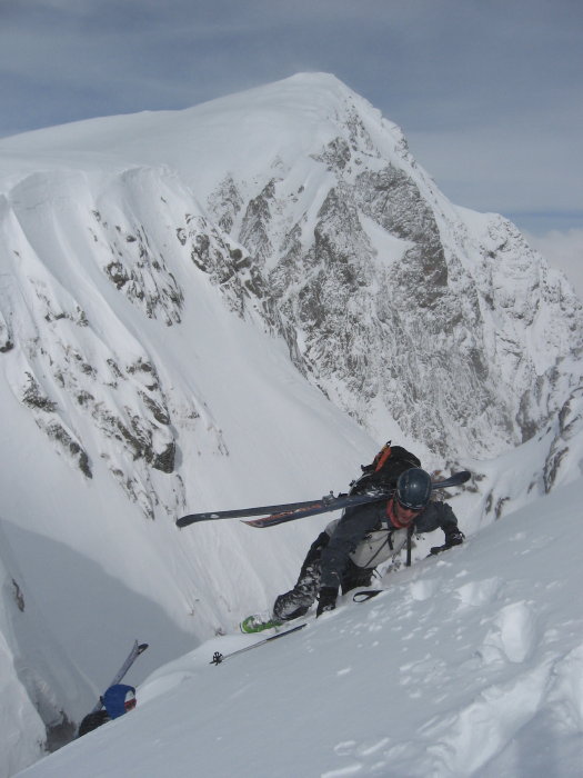 Partis pour l'infernet, ca sent le but dès le parking: où sont les 10-20cm de fraiches annoncés? On monte quand même pour voir sans grandes espérances. Vent de N violent au sommet remontant le couloir en rafales: la neige semble toutefois bonne (pas de verglas ). tentative dans la première branche avortée pour cause de plaque à vent : on n'a pas voulu en tester la solidité d'autant plus qu'il n'y avait pas de zones de protection possibles sur les rives. 2nde tentative dans l'autre branche : on se rend vite compte que ca ne va pas être du grand ski (surtout les 1200m du bas!) donc on n'insiste pas. En revanche bon ski sur la voie normale du galbert qui sauve bien la journée.