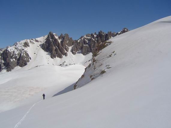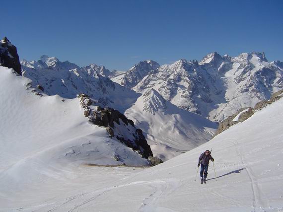 Montée au col Termier, puis au col donnant accès au couloir de la Clapière, descente jusqu'à 2200m, montée au Collet du Clot Jullien, puis retour au point de départ. D+/- 2000m sans passer par le sommet du Gd Galibier. Le passage du Col Termier est un peu alpin actuellement du fait de mauvais enneigement des 100 derniers mêtres. La montée au Collet de Clot Julien est paumatoire, en cas de brouillard, y'a interêt à tirer au col de la Ponsonnière pour rejoindre le Pont de l'Alpe