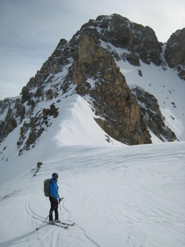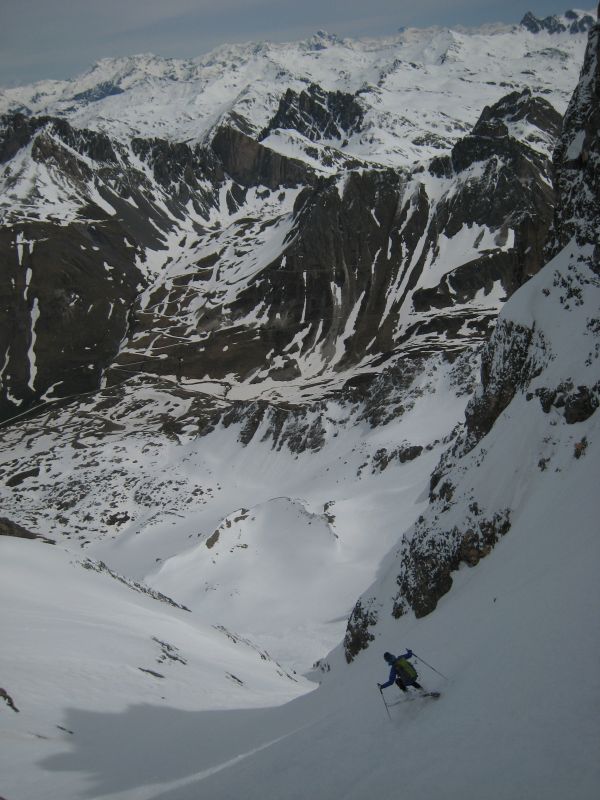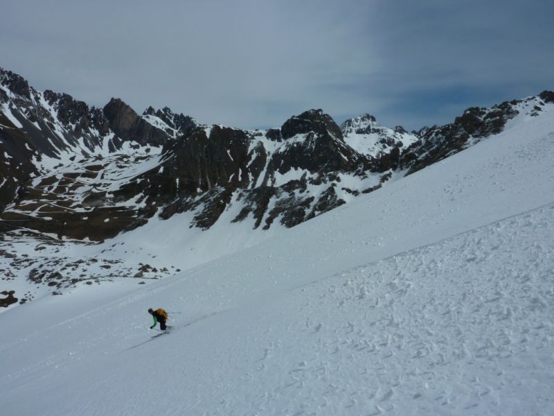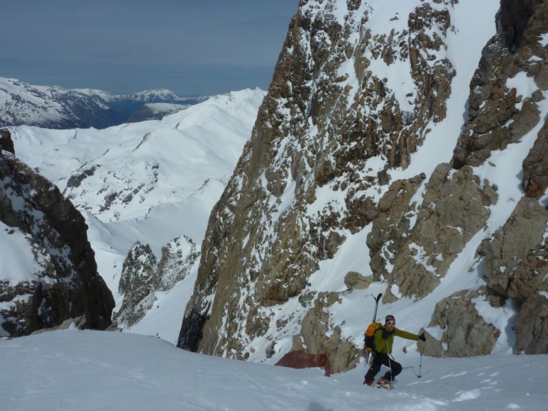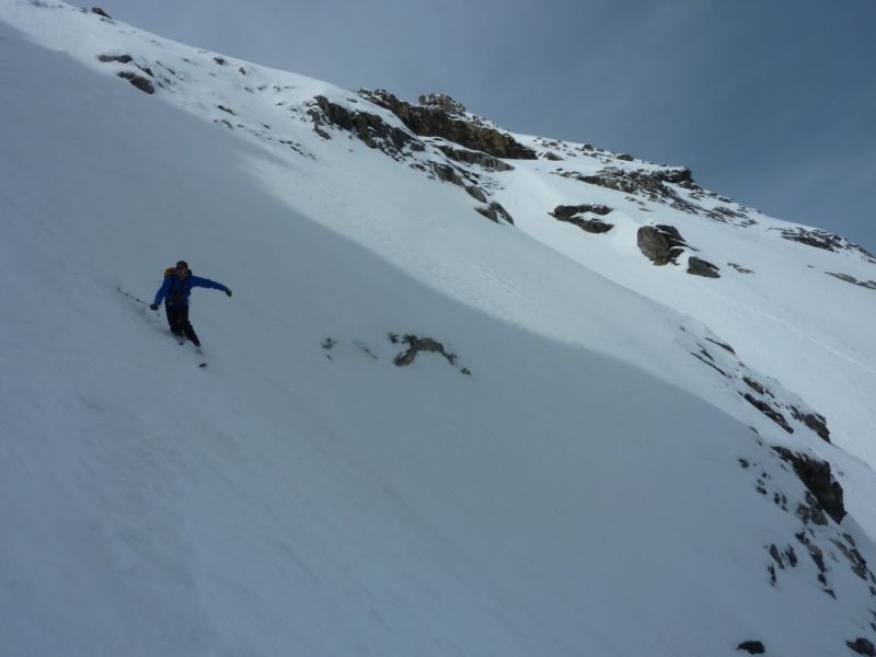 Les orientations ouest à sud n'ont pas regelé la nuit. ça donne une petite couche de poudre sur une bonne vingtaine de neige pourrie, non regelée. Dans le couloir de la Clapière, la neige est très variable : bonne dans le haut mais tout de même assez cartonnée puis pas mal de reliefs sous l'étroiture avec un centre plutôt gelé. Plus bas grosses coulées et ça a purgé encore à notre passage venant des pentes ensoleillées déversant dans le couloir.