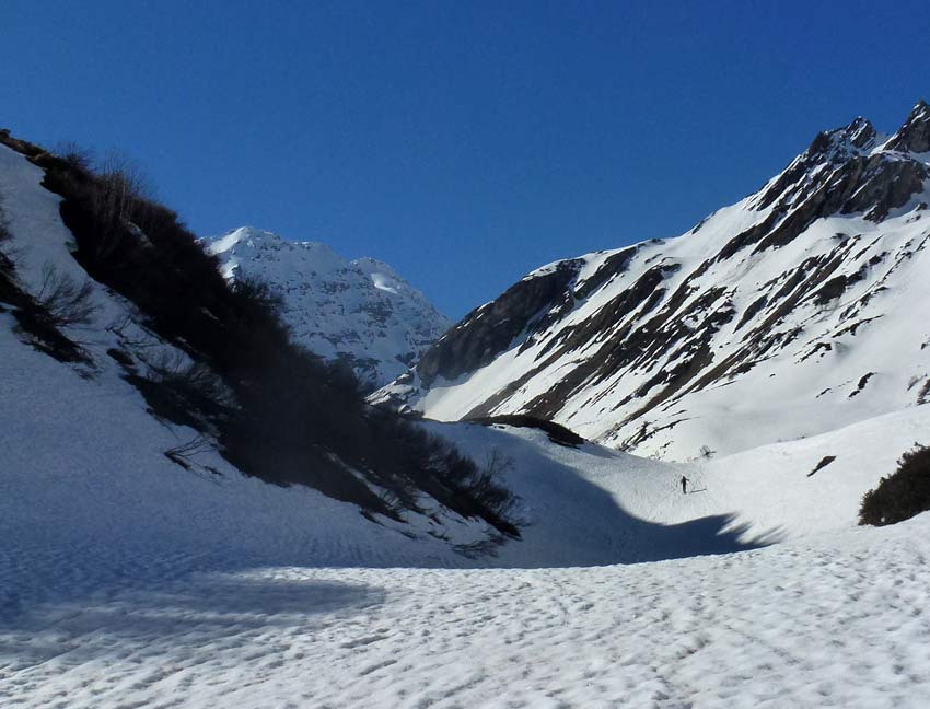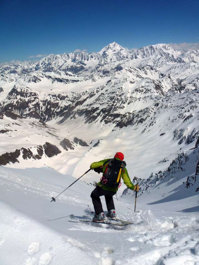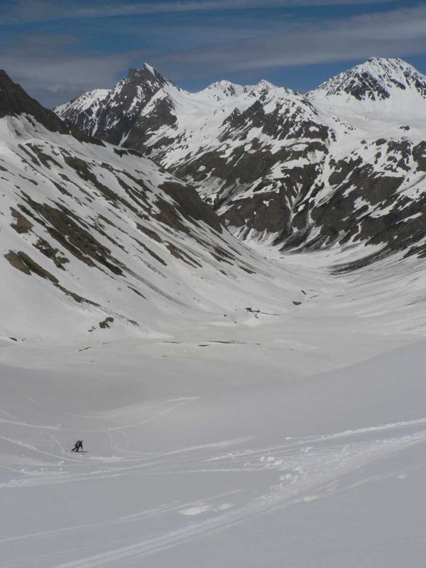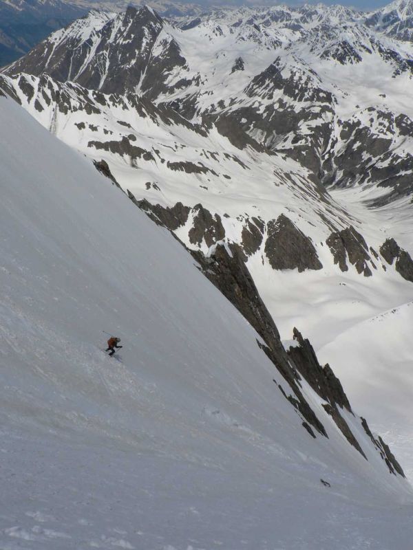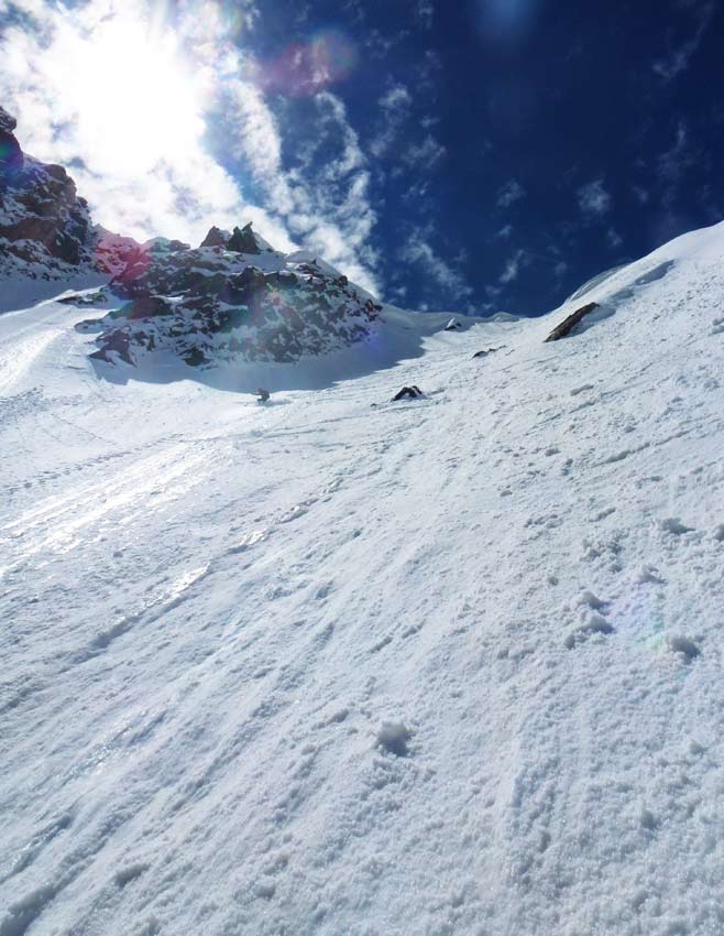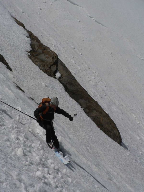 Beau couloir de presque 450 m, pas trop raide (4.2). Conditions acceptables dans le couloir, bonnes dessous.