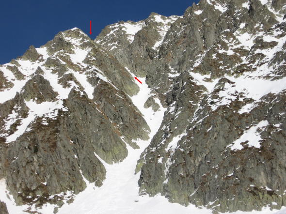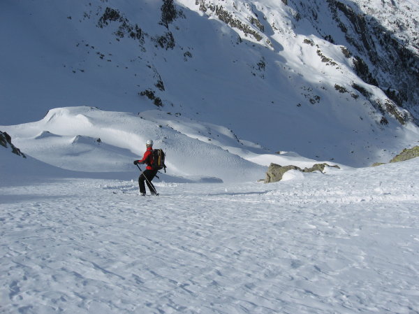 Montée par le replat et le col de la pierre jusqu'à la pointe des chamois. De là on descend versant W pour franchir des petites barres et traverser plein N pour passer la base d'un éperon rocheux et atteindre le pied du couloir. F8.1 (couloir O, SO). Couloir de 300m de haut environ au sommet duquel on peut rejoindre le sommet du grand miceau par l'arête (à pied ce jour). Pente entre 45° et 50° surtout les 150 derniers mètres. Semble plus soutenu que ce que l'on a vu de l'itinéraire "classique" F8. Cot: un bon 5.1. Retour par une traversée qui permet de rejoindre le col de la pierre et la bonne poudre de son vallon E. D+/D-: 2100m