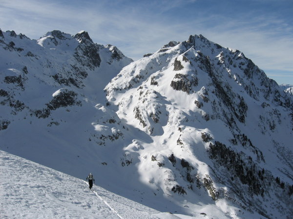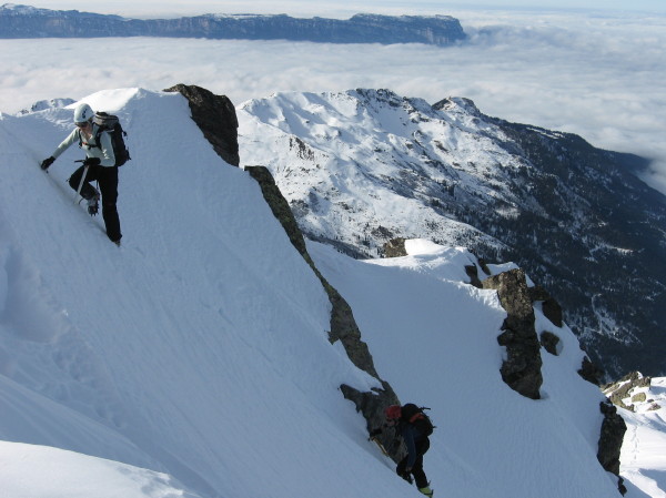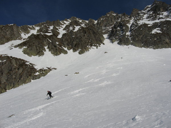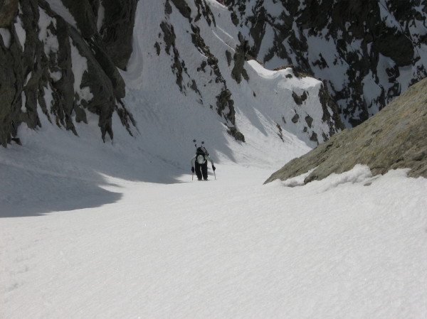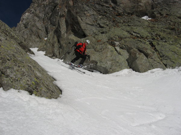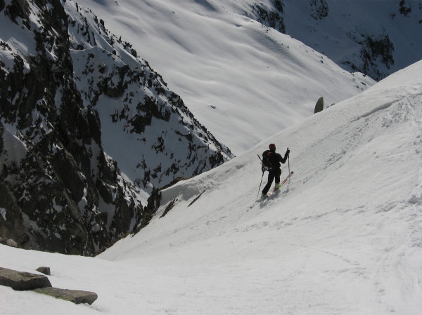 Repéré le WE dernier lors du tour du Pic du frêne avec un petite incertitude sur le remplissage de la partie médiane encaissée et dérobée à notre vue: finalement ca passe bien avec une bonne neige toutefois délicate et empêchant de trop lacher les chevaux. Ca fait du bien de refaire un peu du raide vu les conditions déplorables de ce début (je n'ose dire la fin ) d'hiver...Journée test des nouveaux skis BD: les Ethic (pour les garçons) et Mystic (pour les filles) qui réussissent avec félicitations du jury leur sortie d'intégration!