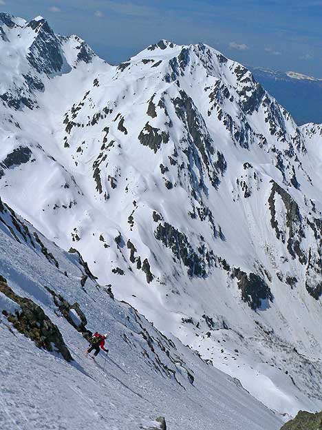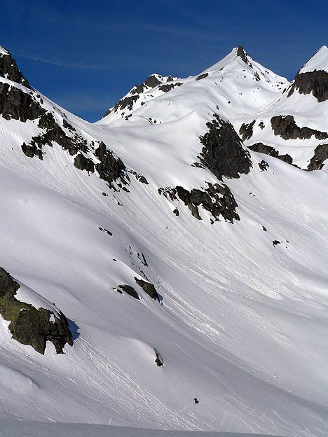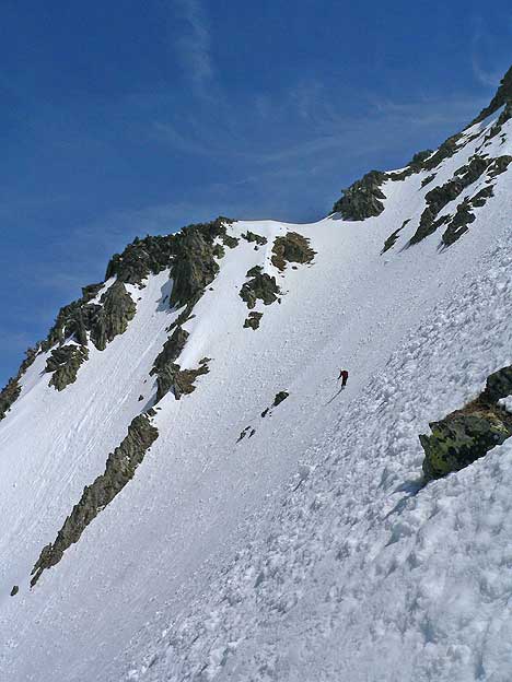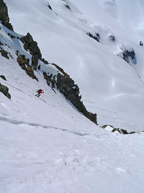 Une jolie face exposée, pas une trace, un peu de raide : c'est ce qu'on était venus chercher ici. Le départ à skis du sommet (souvent mal enneigé en hiver) se fait nickel à cette époque et c'est le plus beau de la course. Il serait dommage de s'en priver. Le bémol : le faible regel sous 2000 et une belle séance de ski nautique avec une belle coulée de lourde déclenchée par nos soins. Sauf que l'on n'avait pas vu deux piétons dessous. Fort heureusement, la coulée s'est dispersée quelques mètres au-dessus d'eux.