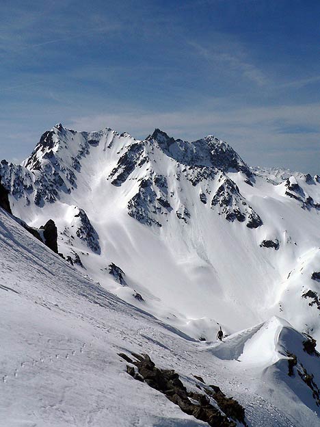 F8. Côté pente : le plus raide se situe dans les derniers mètres en dévers de l'arête (50° bien tassé sur qq virages). Pour le reste, F8 comme le couloir sud-ouest F8.1 ne dépassent pas le 45° et sont réguliers autour de cette inclinaison. Cotation à baisser d'un cran. Côté accès. En hiver, il vaut mieux venir par la Maurienne et le col de la Pierre mais au printemps, la sauvage vallon de St-Hugon retrouve toute sa magie quand les vernes sont bien couchées par la neige et que l'on accède en voiture suffisamment haut.
